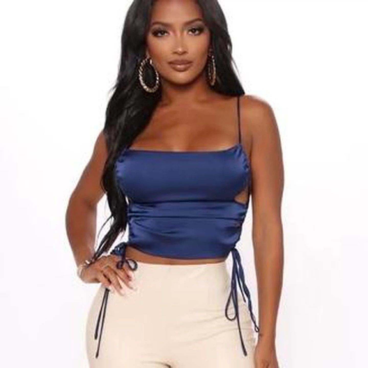 Fashion Nova All Caught Up Elegant Navy Blue Satin Tie Up Top