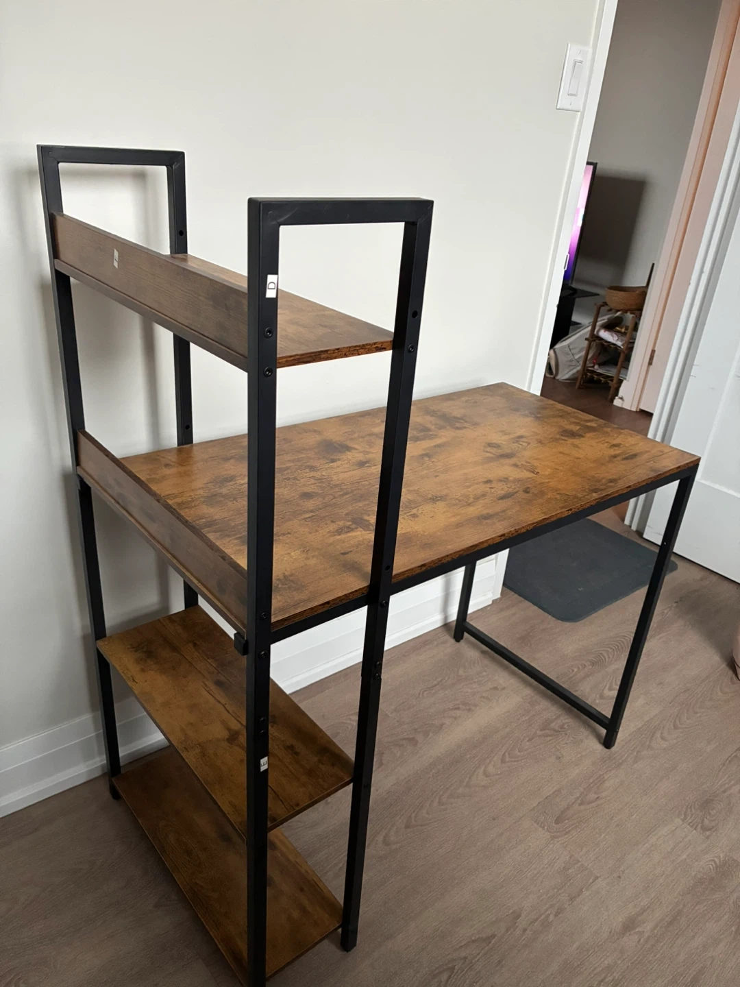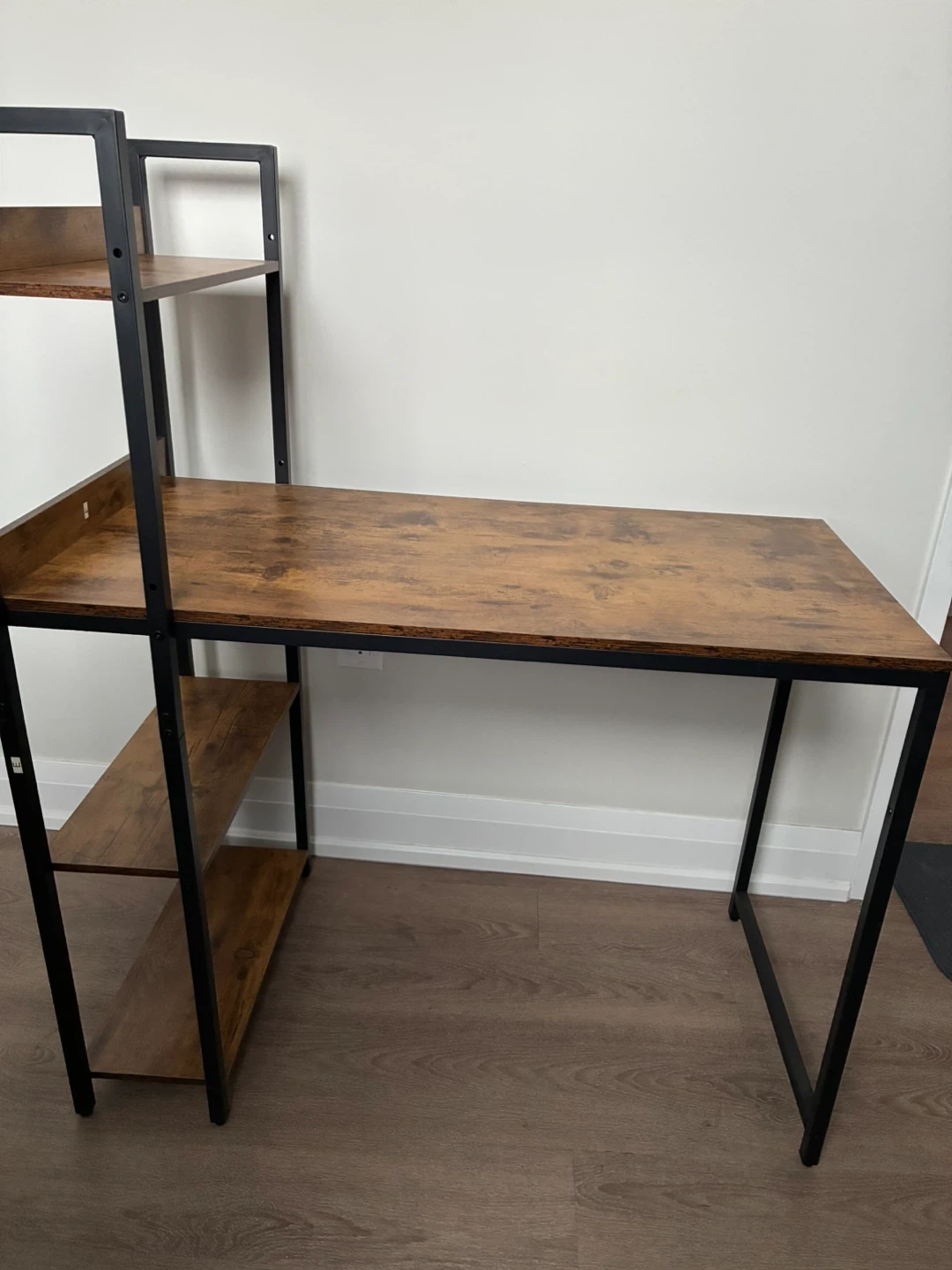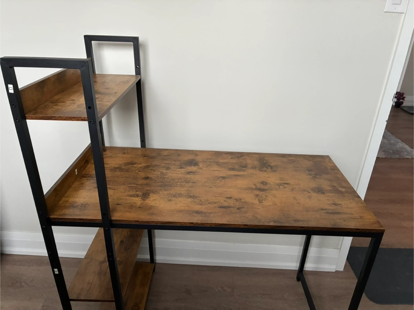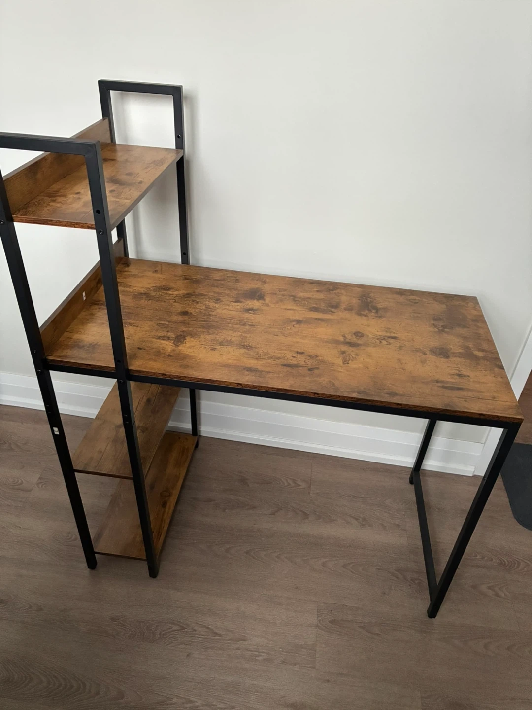 Selling a stylish industrial-style computer desk featuring built-in shelves! It's perfect for creating a functional and organized workspace. The desk has a wood-look top with a black metal frame, adding a modern touch to any room. Great for students or anyone working from home