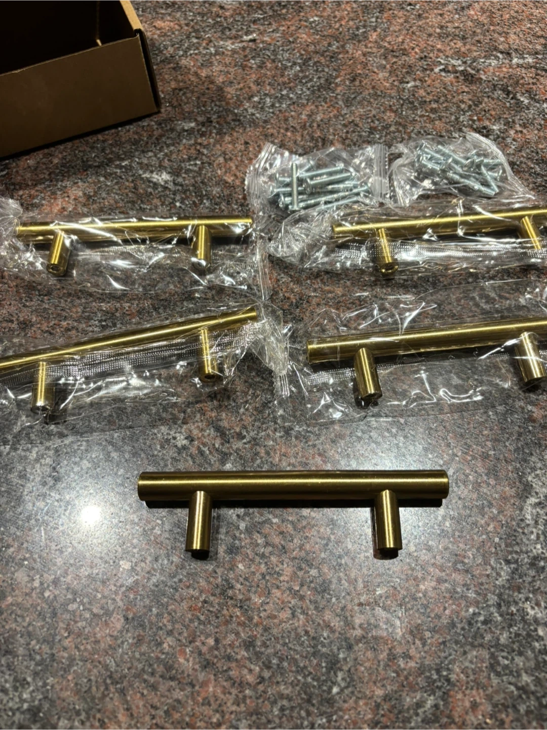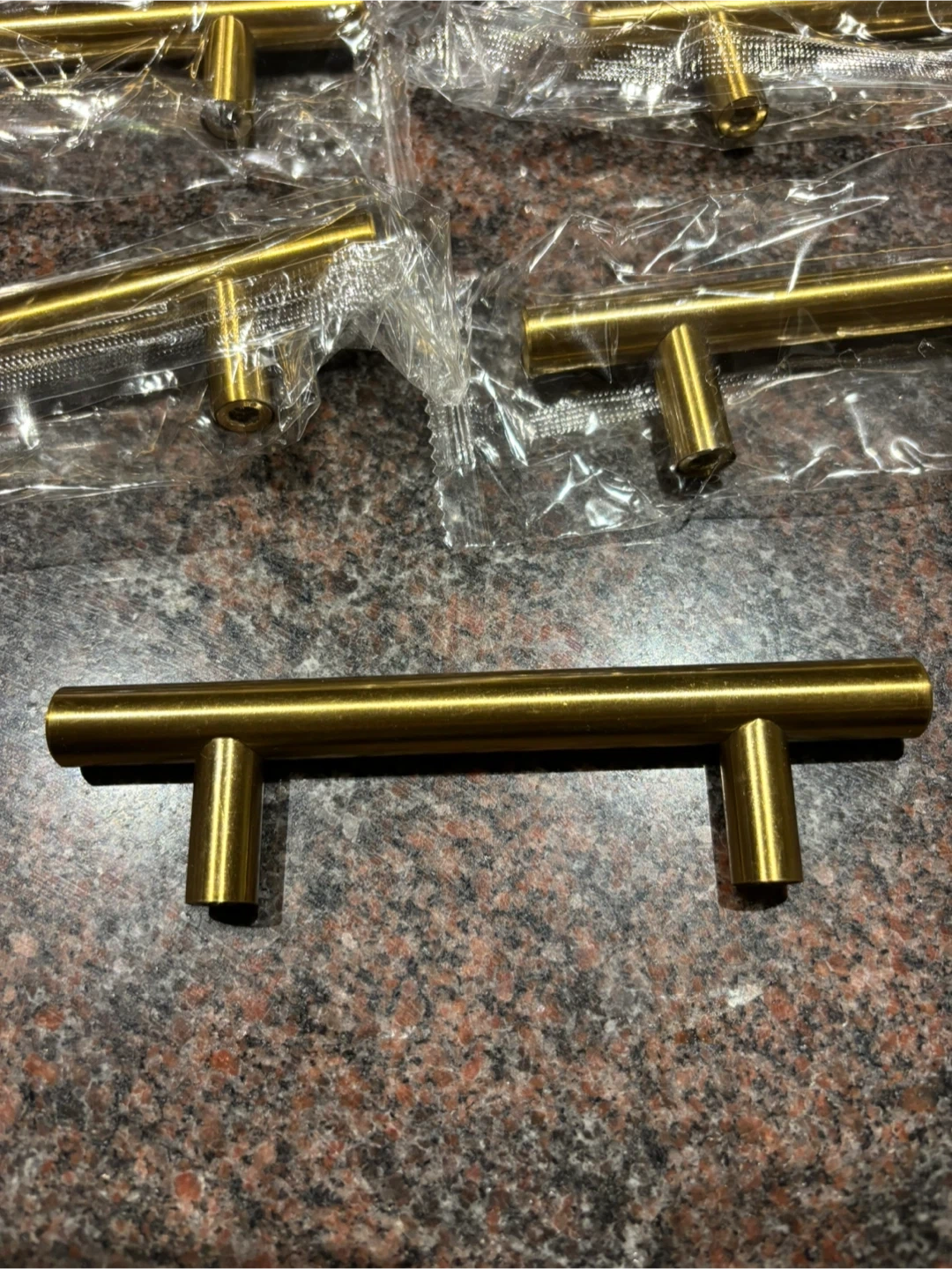 Selling a set of brand new gold cabinet drawer pulls! They're still in their original packaging and come with all the necessary screws. Perfect for updating your kitchen or bathroom cabinets with a modern touch 3”