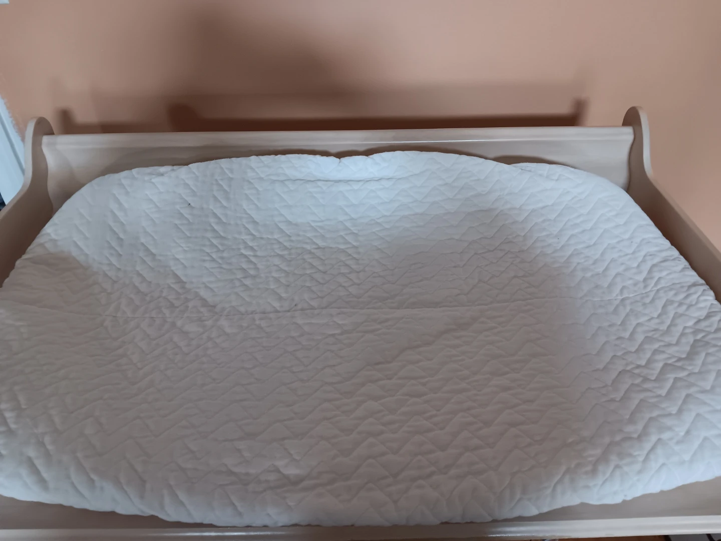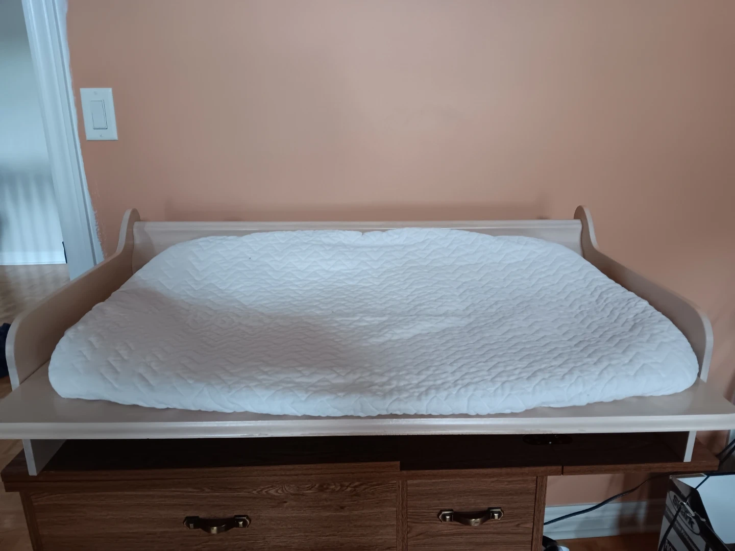 Selling a changing table with pad attached. It's in good condition and ready for a new home. Perfect for keeping your little one comfy and safe during diaper changes. This table can be mounted on any dresser or table with the proper screw fasteners (not included). Change pad comes with a cover that is easily removable for washing. Table is made of solid wood and is in fair condition. CASH offer only.