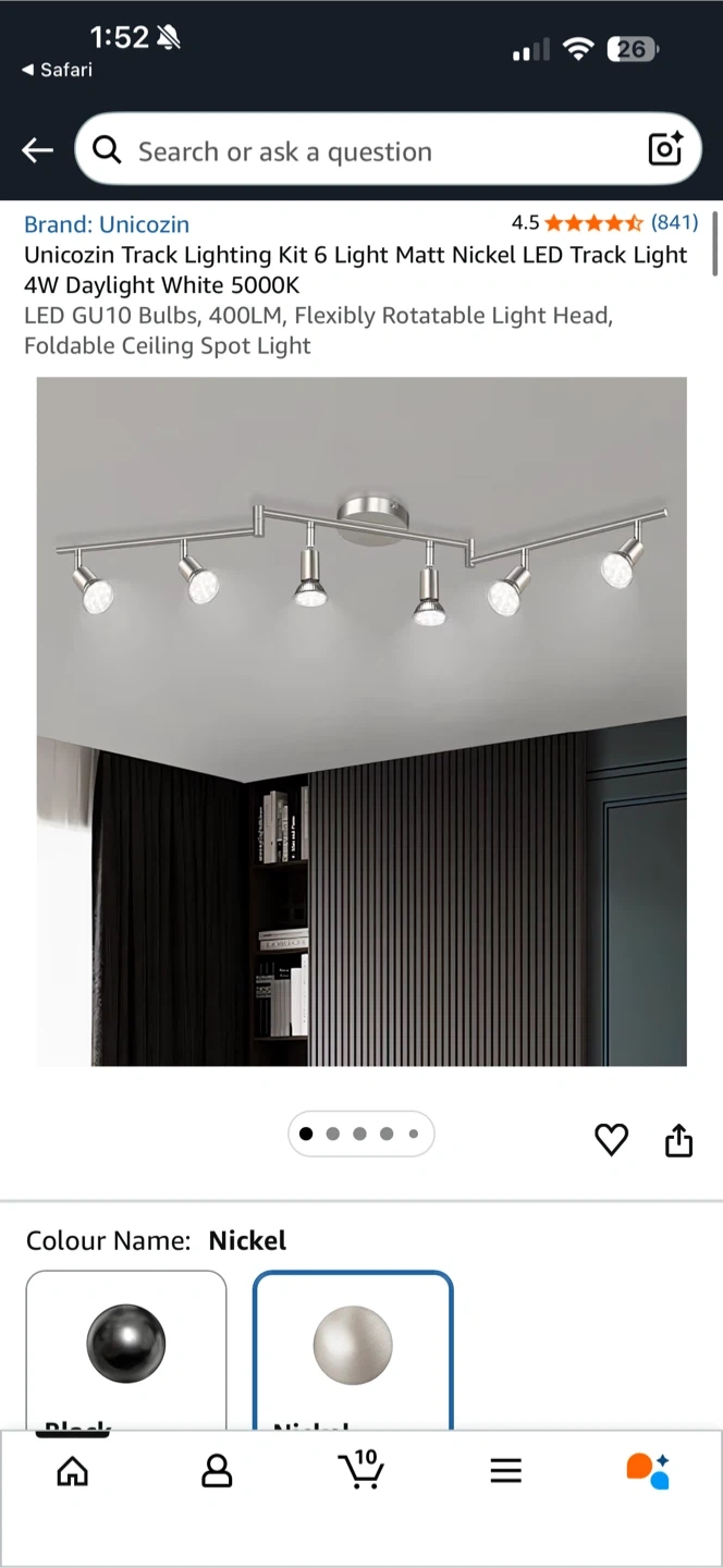 Selling a Unicozin track lighting kit with 6 lights in a nickel finish. It features LED GU10 bulbs, 400LM, and a flexibly rotatable light head. The original price was $74.99