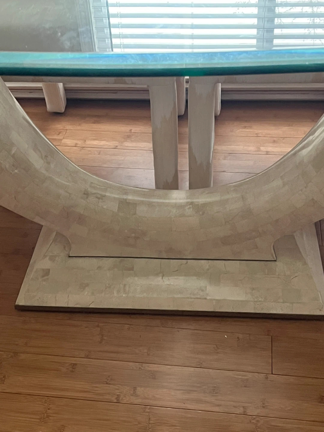 Selling a glass oval dining table with six matching chairs. The table has a unique wishbone base made from fossil stone and the chairs are upholstered in a patterned cream fabric. It's a stylish set that would look great in any dining room!