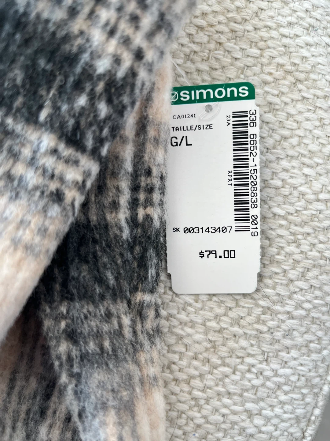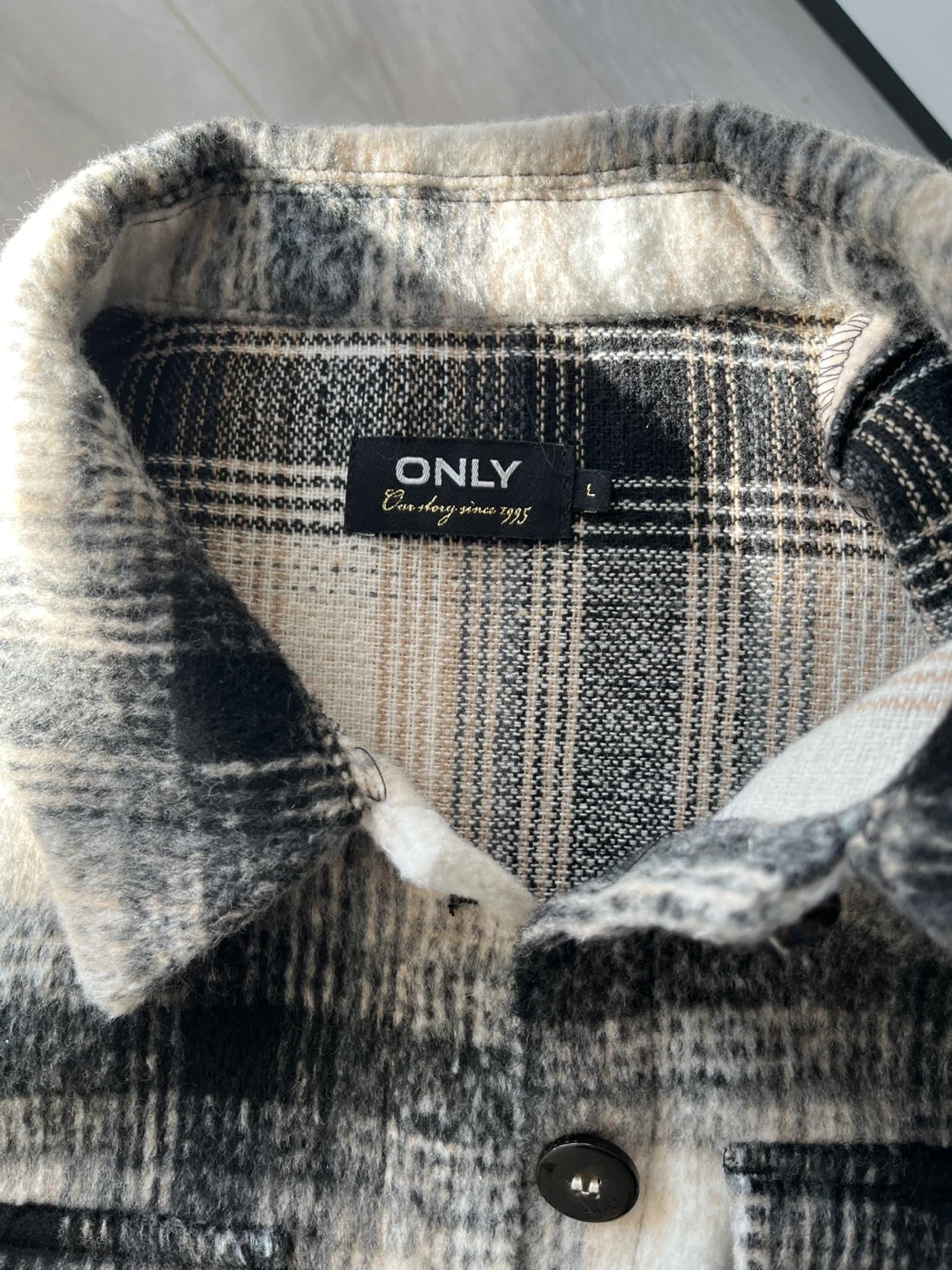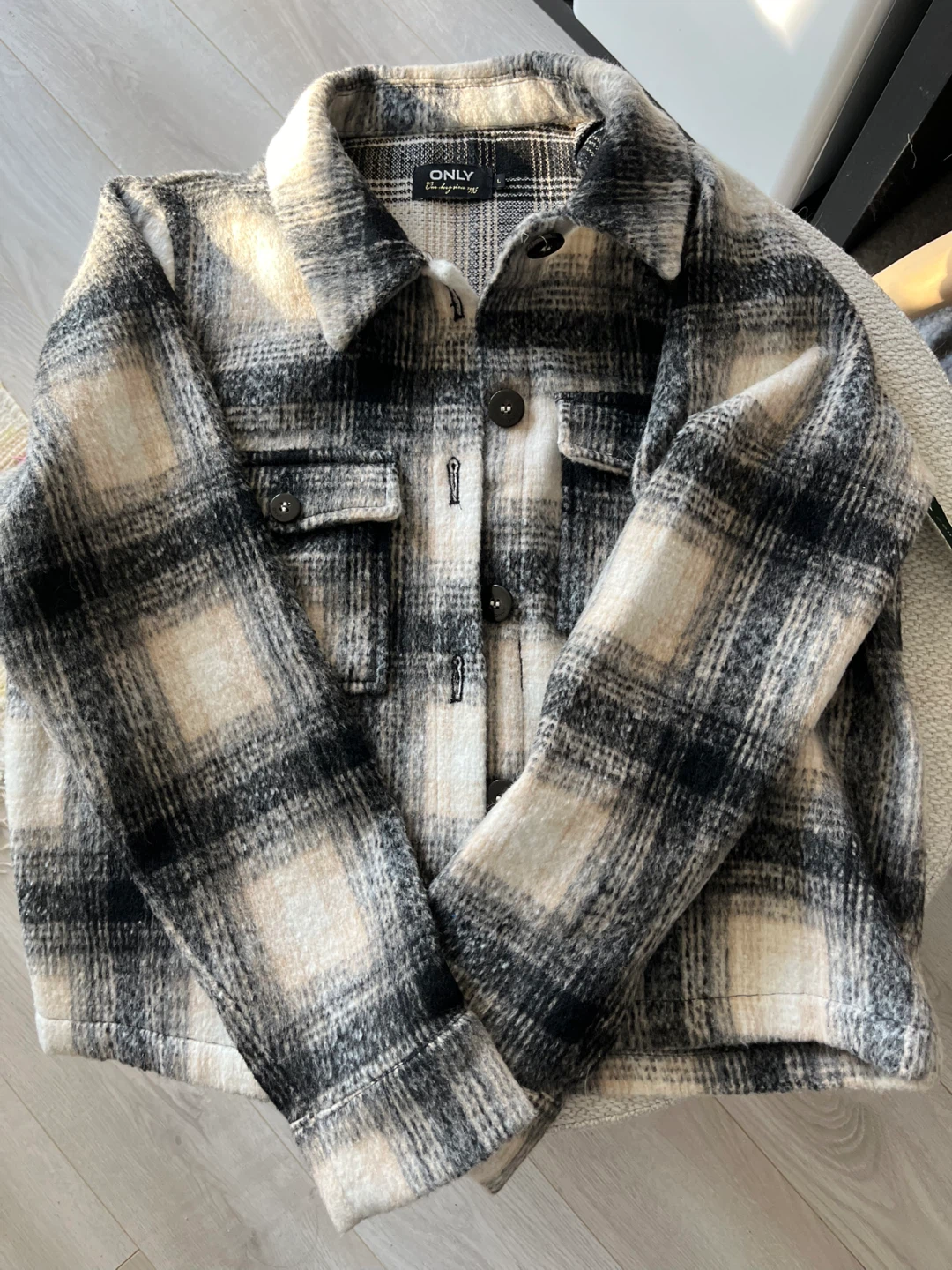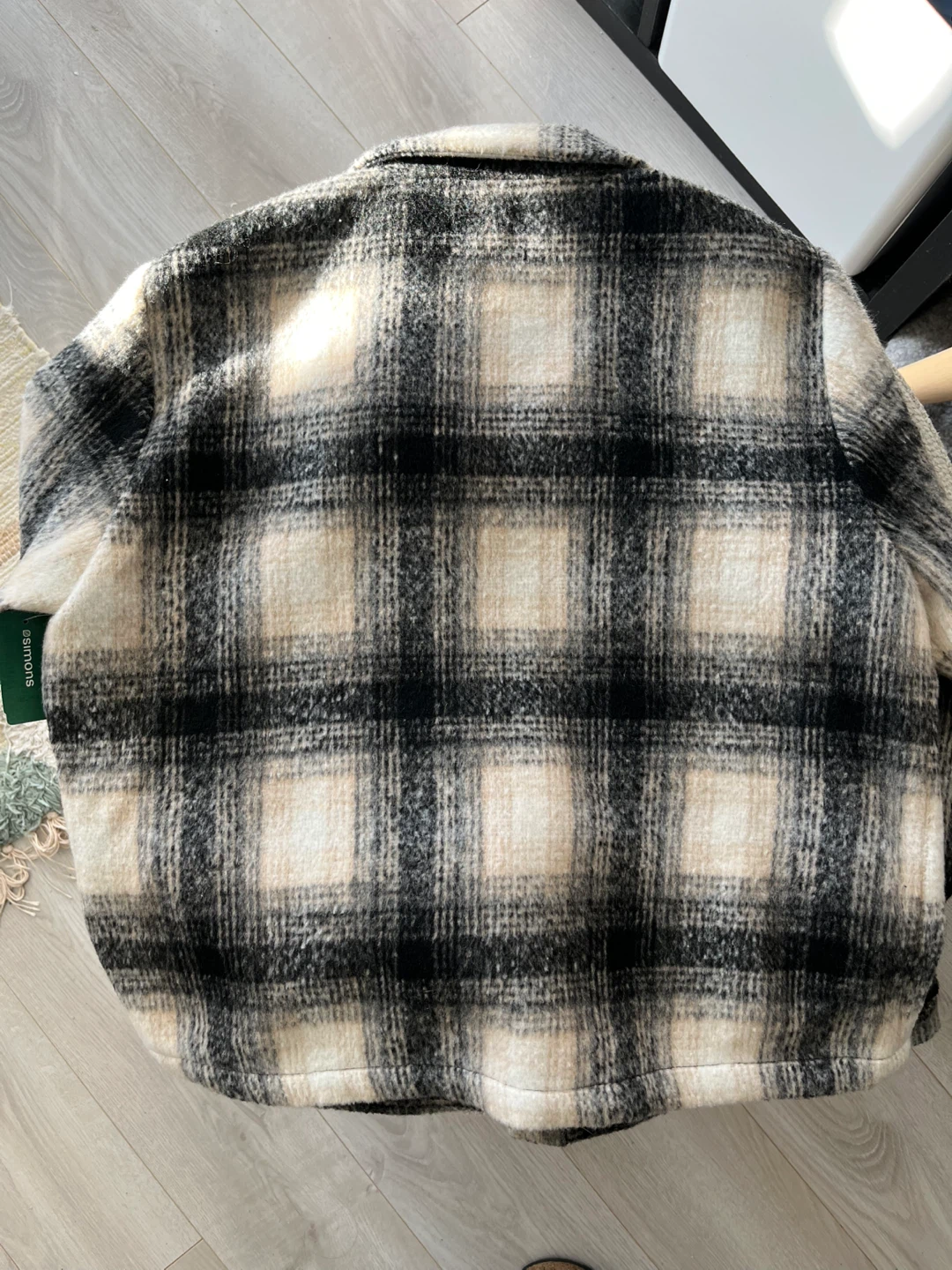 NEVER WORN ! Selling a cozy plaid jacket from ONLY! It's a size large (is a cropped style and can fit S-M) and features a classic black and cream plaid pattern. The jacket has a button-up front and handy pockets. Originally bought for $79 at Simons!