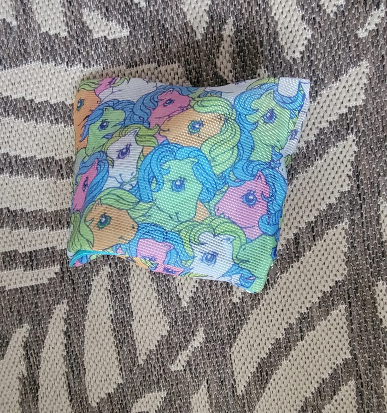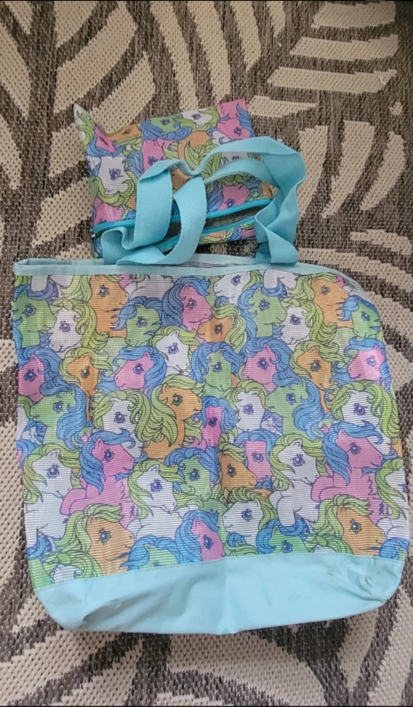 Super cute My Little Pony tote bag and matching pouch! The tote is perfect for carrying groceries or books, and the pouch is great for small items. Both are in excellent condition and feature a fun, colourful design. Folds into a compact pouch.