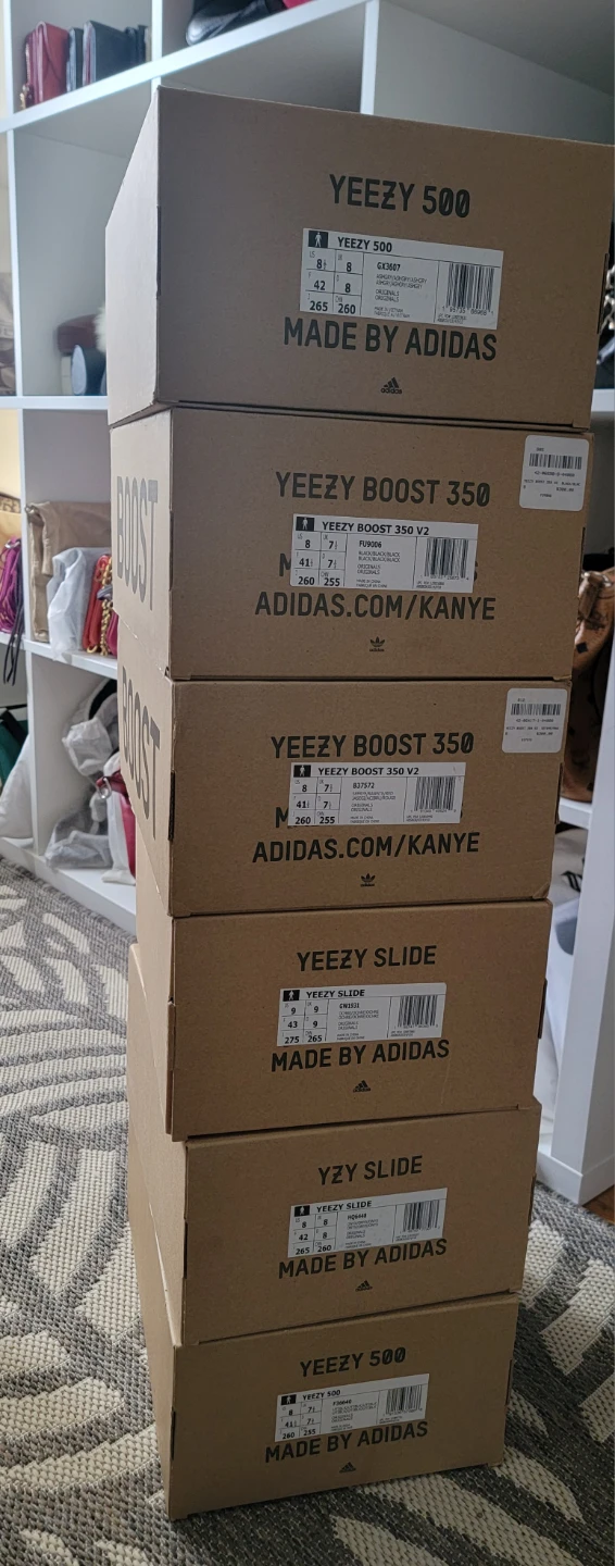 Selling a stack of 6 Adidas Yeezy shoe boxes. Includes boxes for Yeezy 500, Yeezy Boost 350, and Yeezy Slide models. Great for collectors or anyone needing replacement boxes!