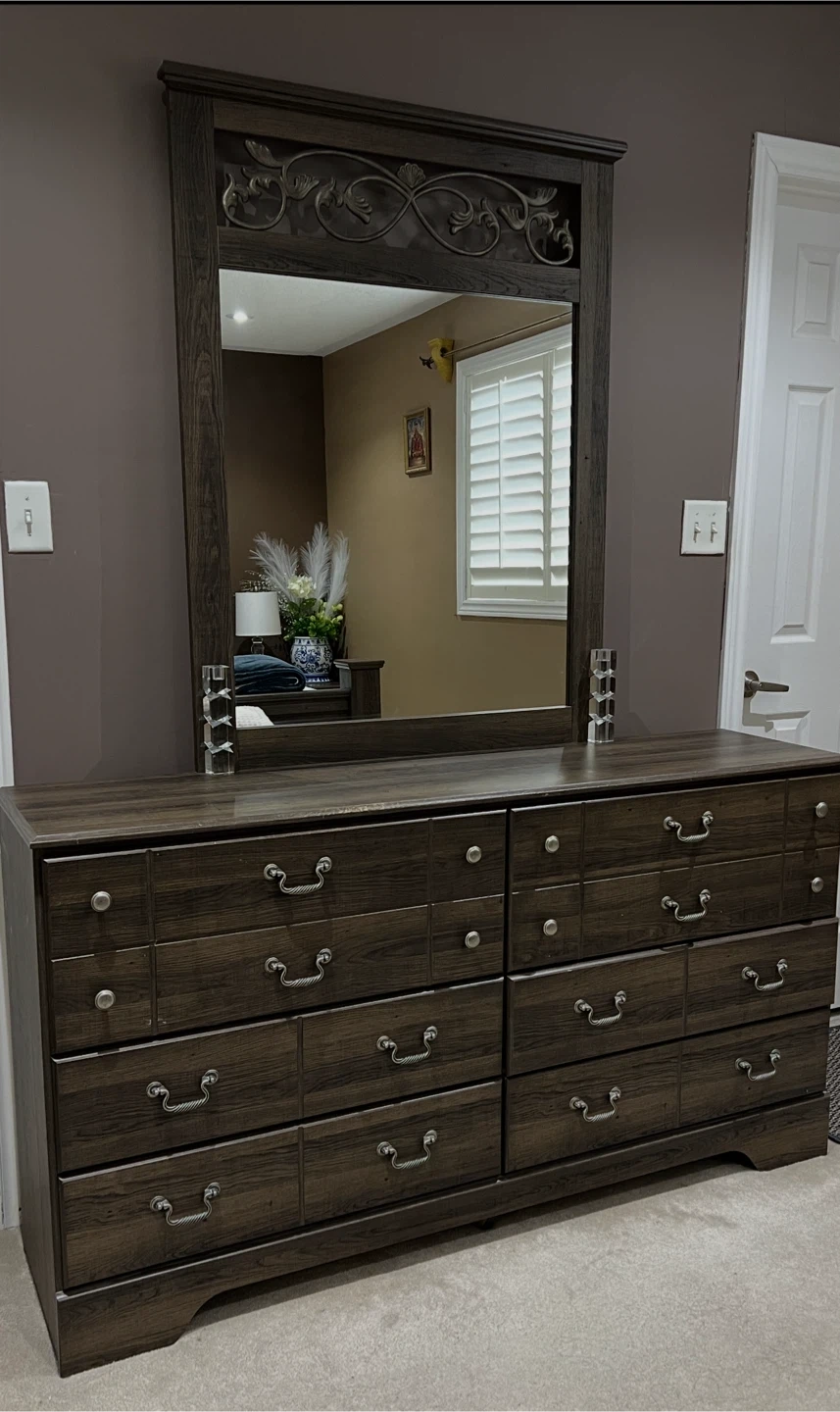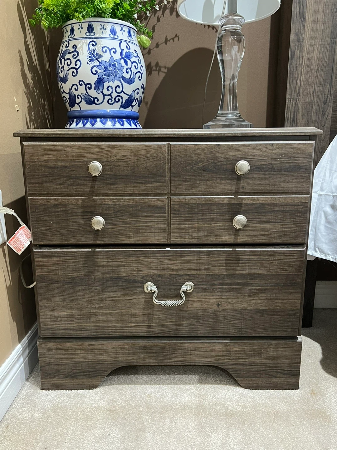 3 piece Bedroom set including a bed, dresser, and nightstand. All pieces are in good condition and would be a great addition to any bedroom!