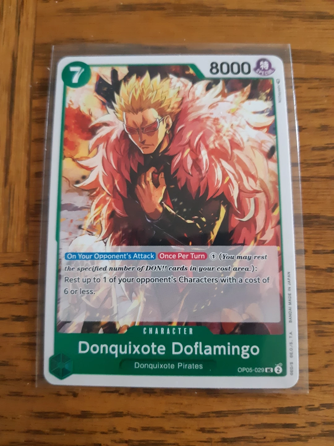 Selling a One Piece Card Game card featuring Donquixote Doflamingo. This card is from the OP05-029 set. A great addition to any One Piece card collection!