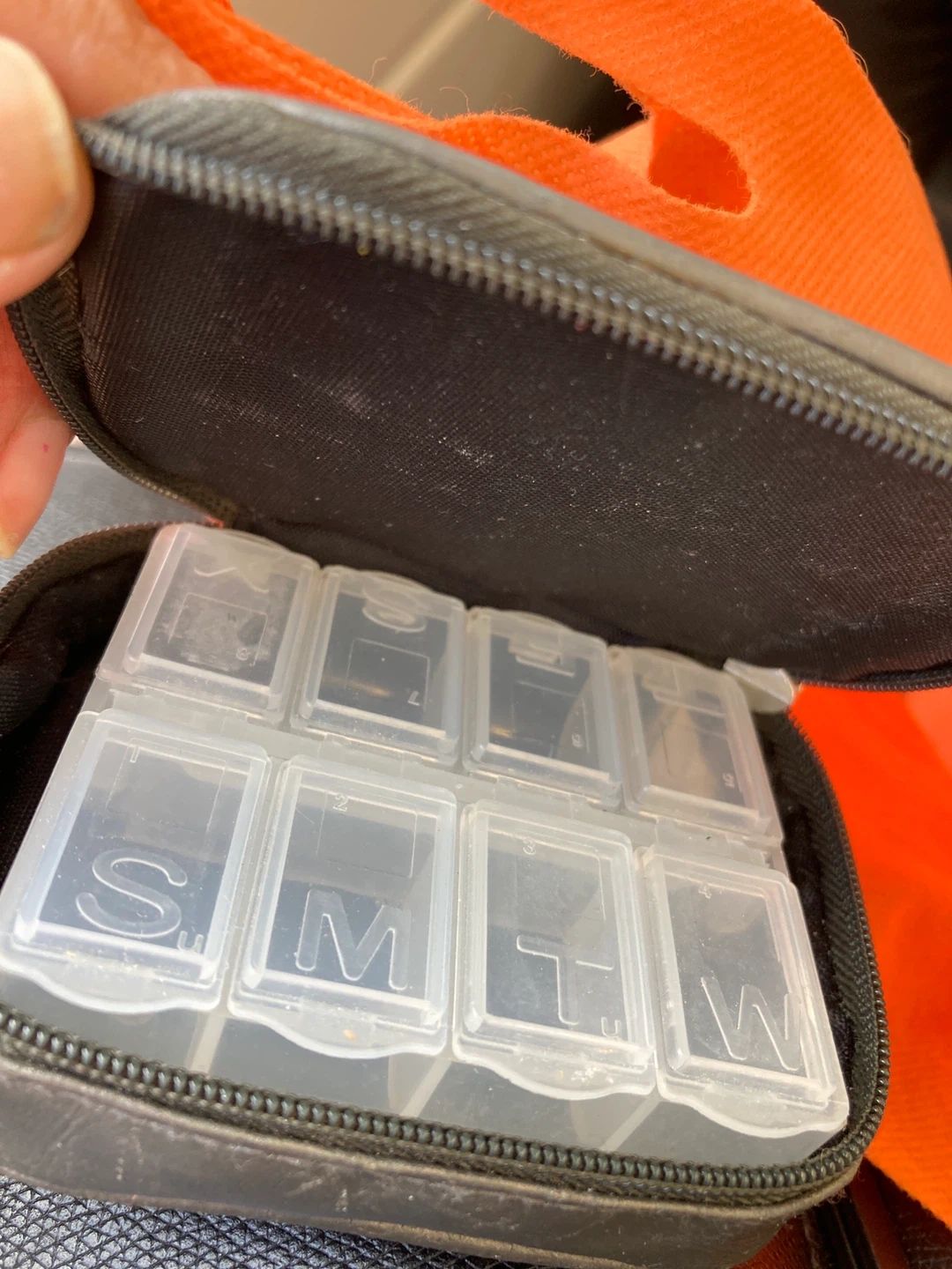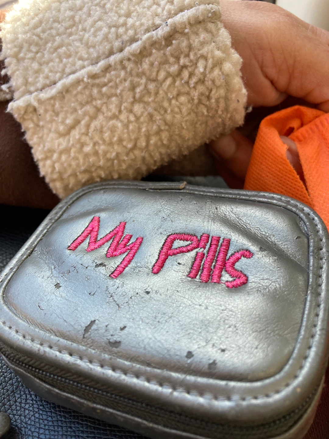 This is a pill organizer case with the words 'My Pills' stitched on the outside. It has a zipper closure and contains individual compartments for each day of the week