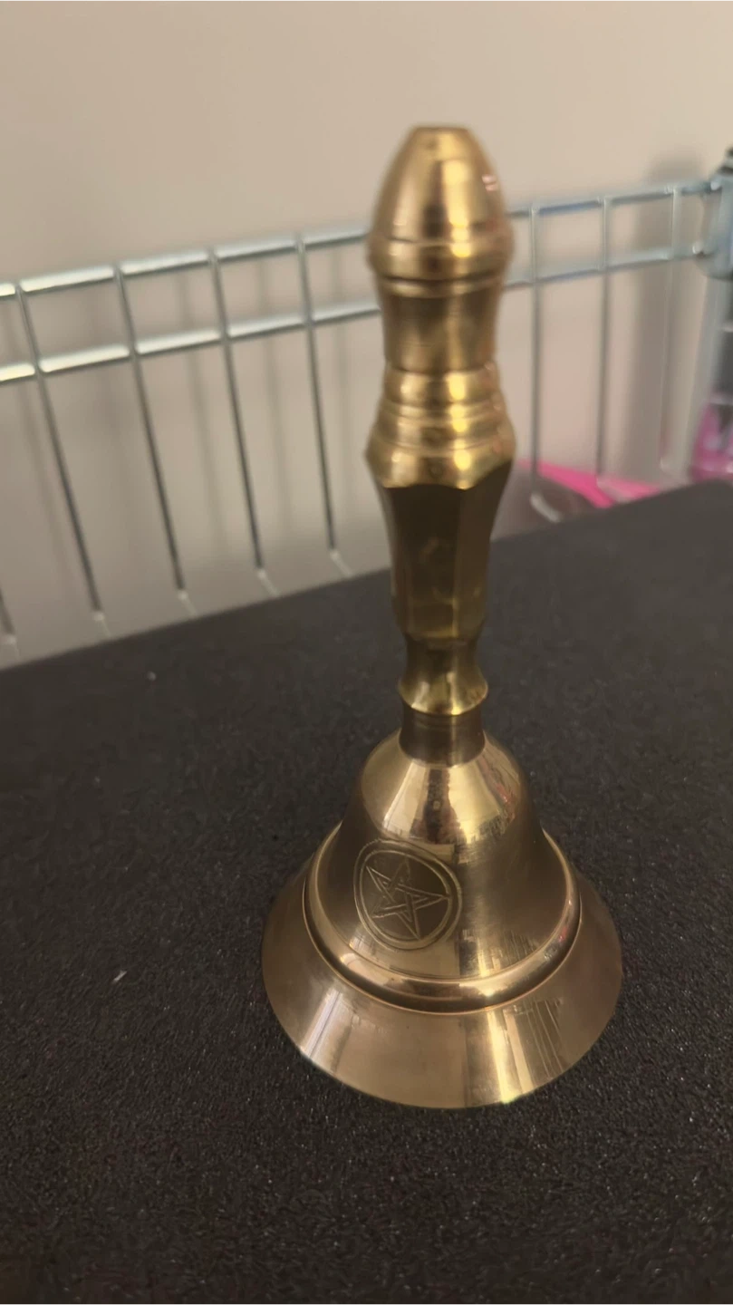 Here's a lovely brass hand bell! It has a distinctive pentagram design on the base. It would make a great addition to any collection or a unique decorative piece