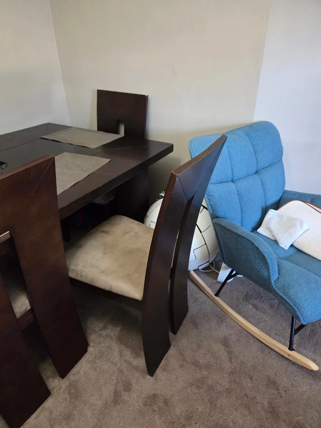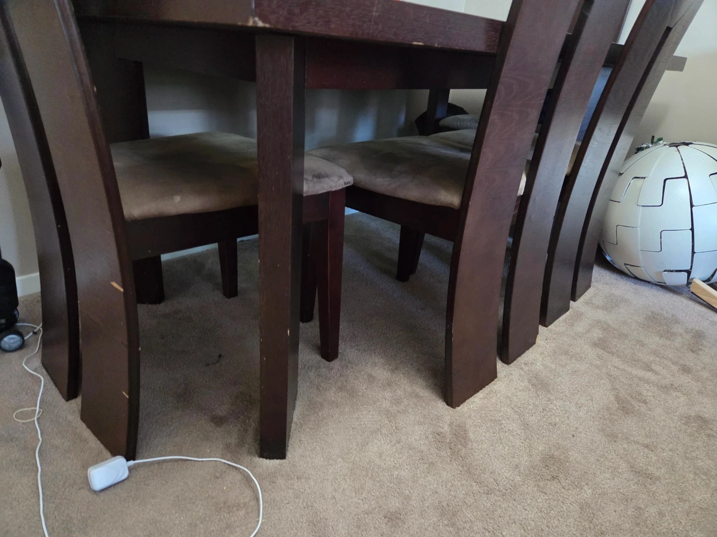Dining table with four chairs available. It has a dark brown finish. There are some signs of use. But an exceptionally rare find. I bought it for 2000 brand new so I have lowered it quit a lot. It is as heavy as it looks so please if you need us to deliver let us know . Depending on the areas going fron A to B we charge 25 to 50 varying on price of gas qnd mileage.