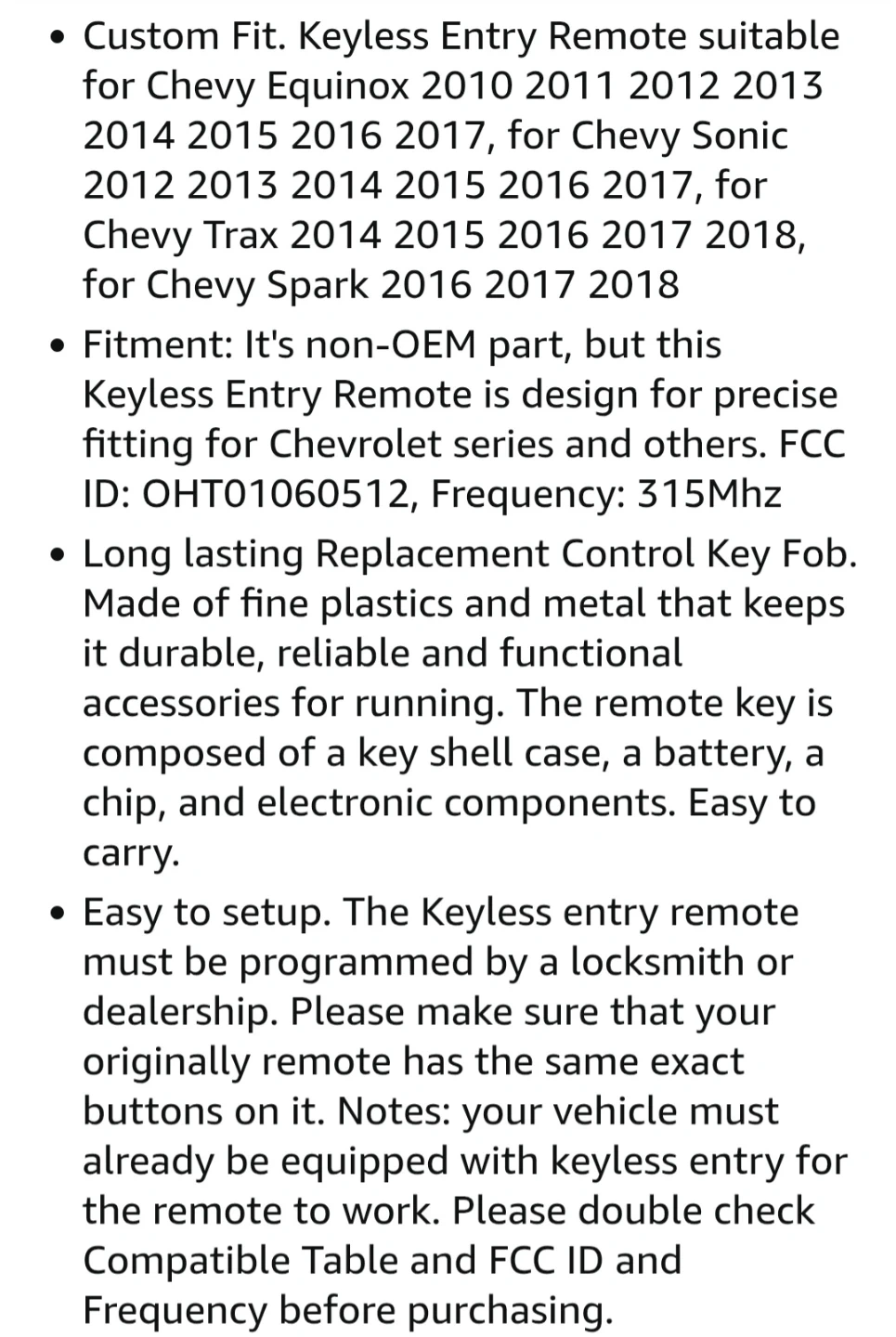 Selling a keyless entry remote suitable for various Chevy models including Equinox (2010-2017), Sonic (2012-2017), Trax (2014-2017), and Spark (2016-2018). It's a non-OEM part designed for precise fitting. The FCC ID is OHT01060512, and the frequency is 315MHz. It's made of fine plastics and metal for durability and functionality. Easy to carry and setup, but it must be programmed by a locksmith or dealership. Please ensure your original remote has the same buttons and that your vehicle is equipped with keyless entry.