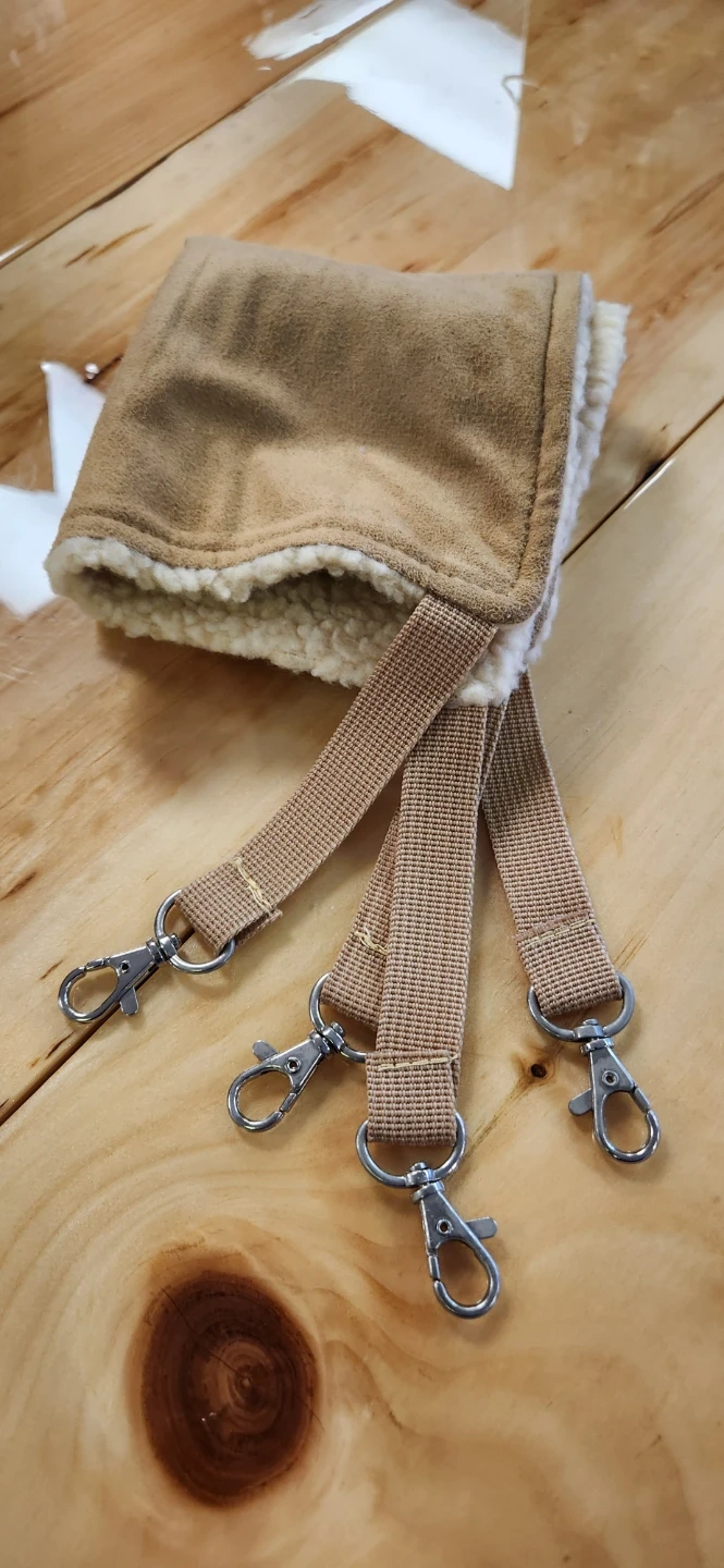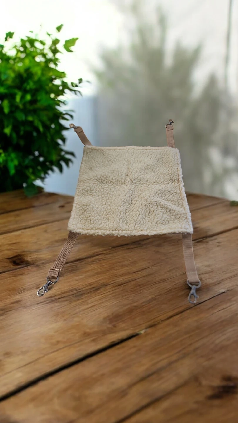 This cozy hammock is perfect for small pets! It's made of a soft, sherpa-like material and has adjustable straps with clips for easy attachment to a cage or carrier. Your furry friend will love snuggling up in this comfy spot
