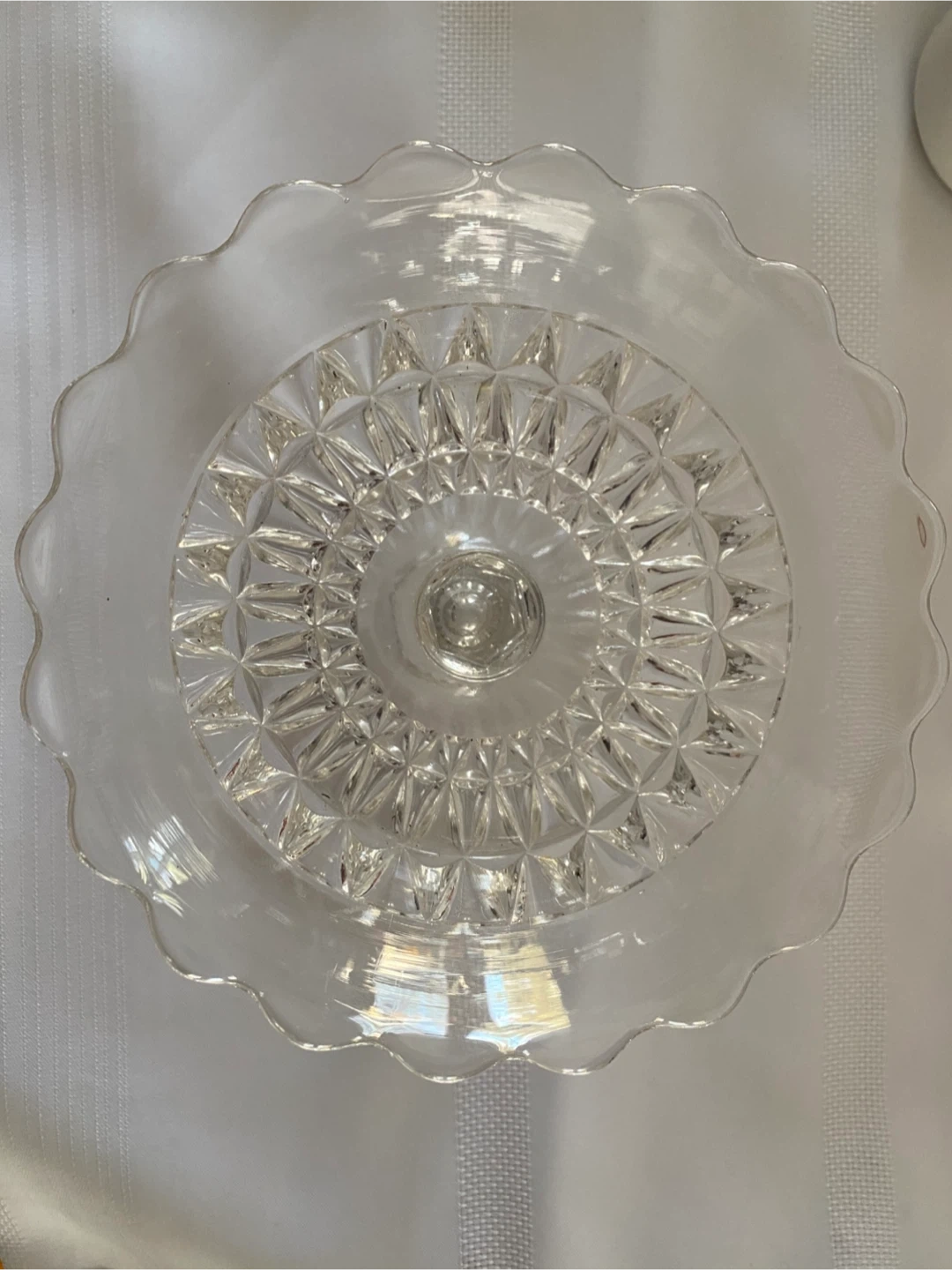 This lovely compote is 6 1/2 inches in diameter and 5 inches tall. It has a scalloped edge and nice detail.