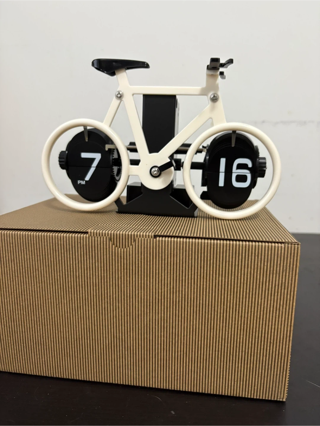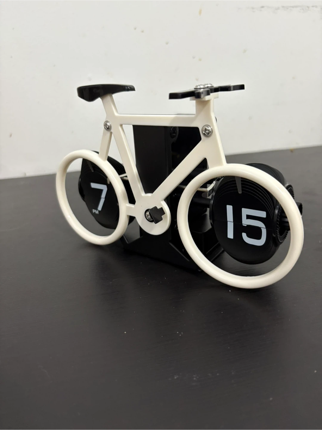 Brand new unique flip clock shaped like a bicycle. Multiple sets are available! Just ask! Comes in complete package and FREE battery. Features black and white color scheme. Shows hours and minutes. Novelty desk accessory. Great for gift giving and fashion decor.
