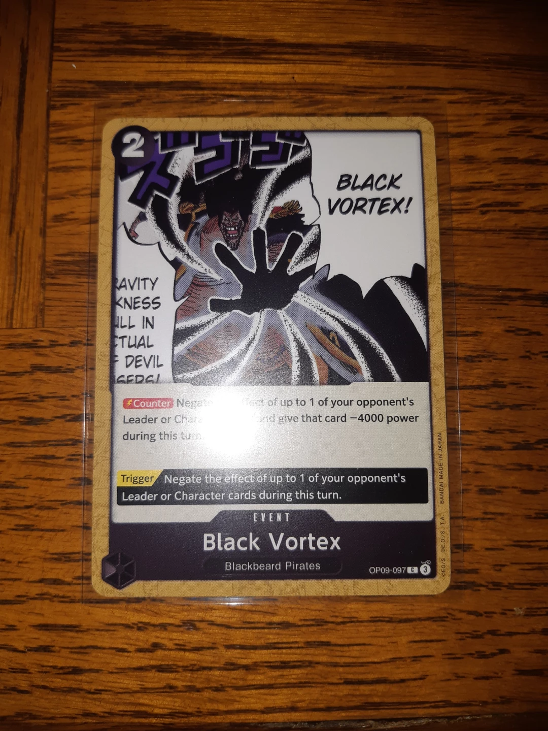 Selling a One Piece Card Game card: Black Vortex from the Blackbeard Pirates set. The card number is OP09-097. It's in great condition and ready for a new owner!