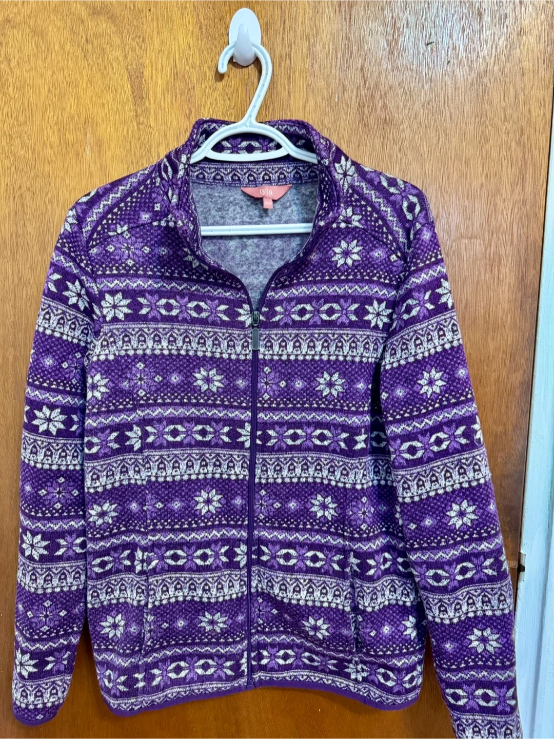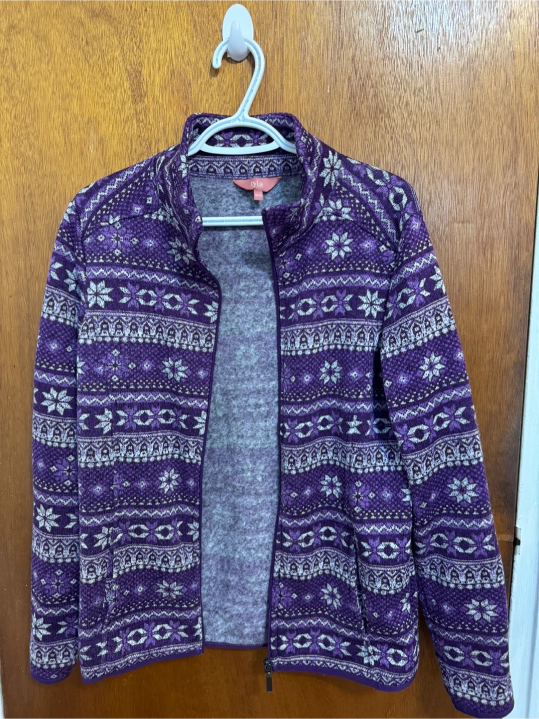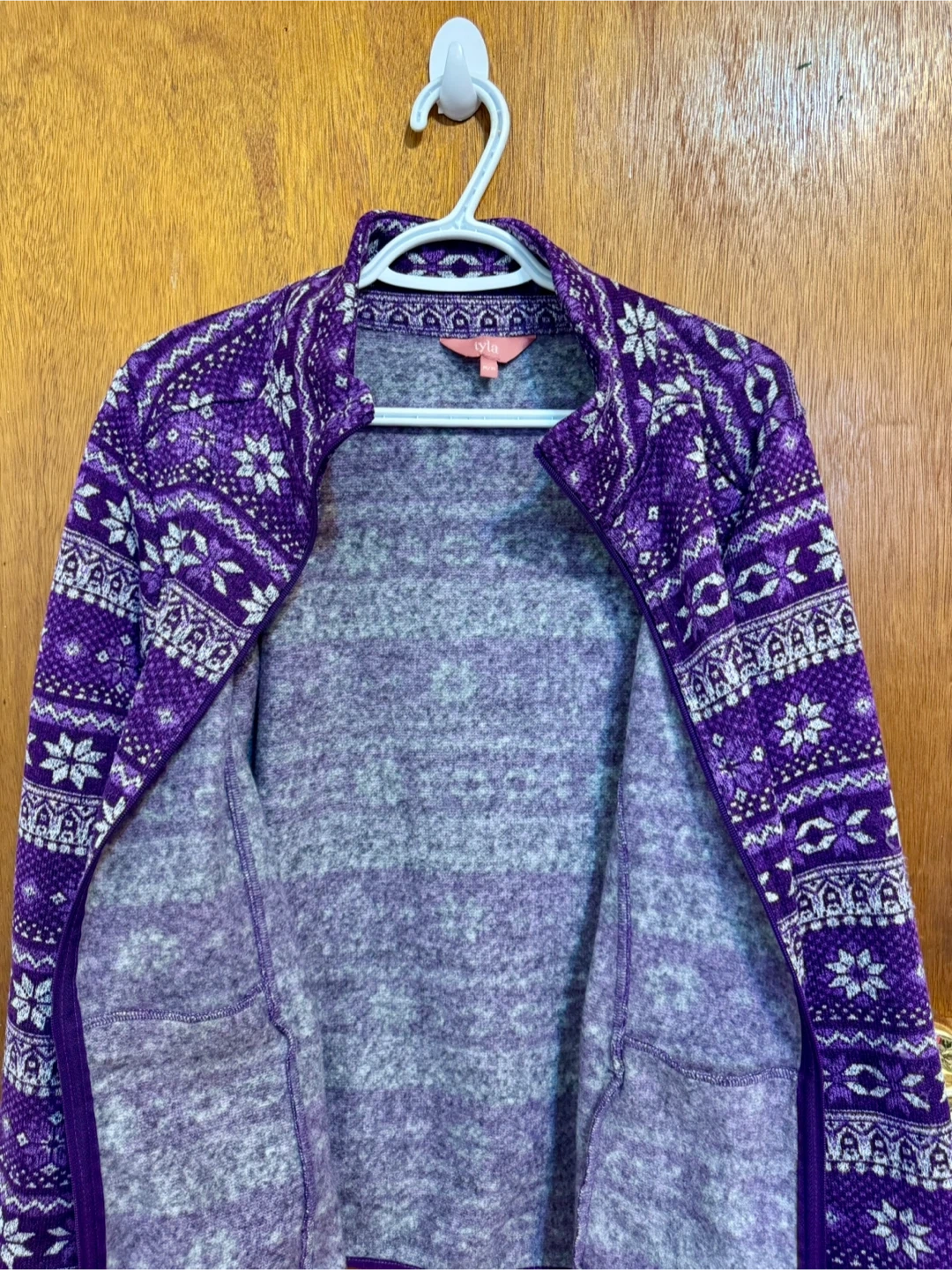 Cozy up in this Iyla fleece sweater! It features a lovely purple and white pattern, perfect for adding a touch of warmth and style to your outfit. It's in great condition and ready for a new owner!