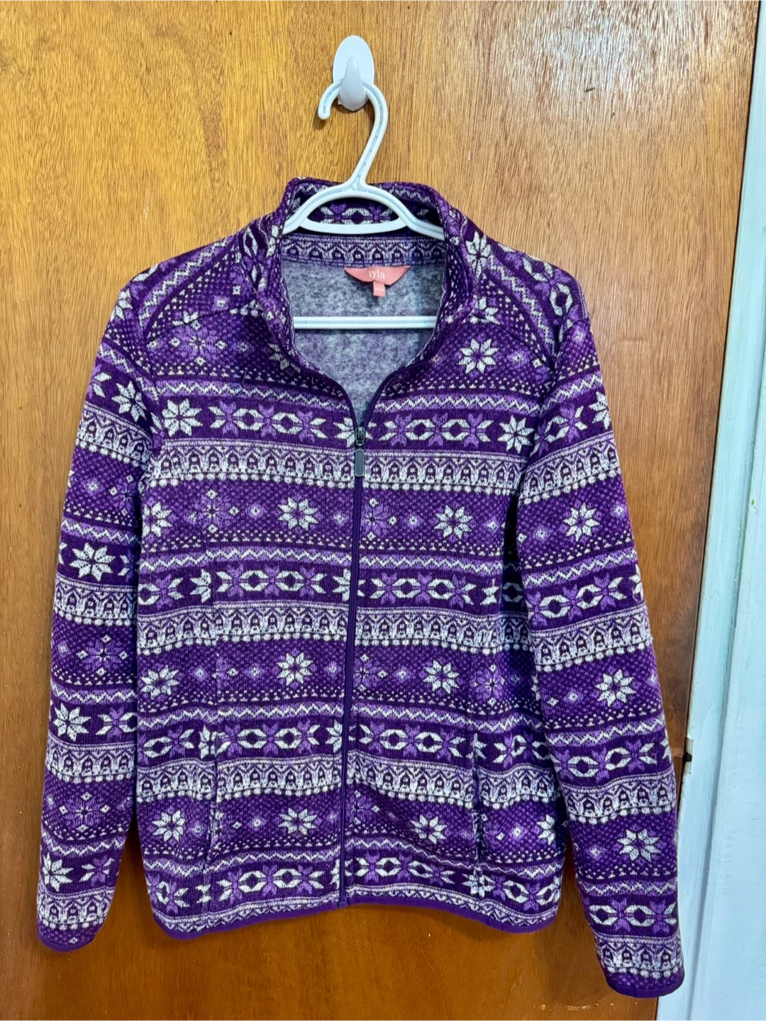 Cozy up in this Iyla fleece sweater! It features a lovely purple and white pattern, perfect for adding a touch of warmth and style to your outfit. It's in great condition and ready for a new owner!