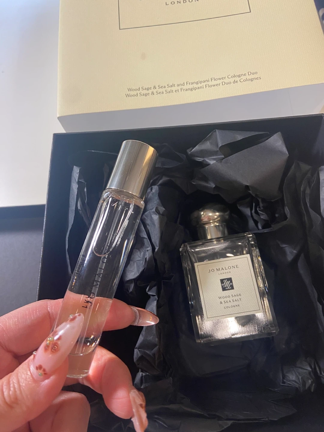 Selling a Jo Malone Wood Sage & Sea Salt Cologne Duo. It includes Wood Sage & Sea Salt and Frangipani Flower Cologne. Comes with the box