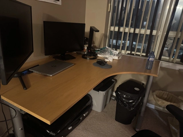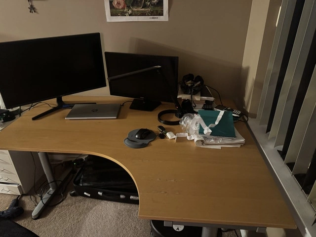 This is a large L-shaped desk, perfect for a home office or study area. While it's a used item, it is still in good condition and offers plenty of workspace. It's a great setup for anyone needing a lot of surface area for computers, paperwork, or creative projects.