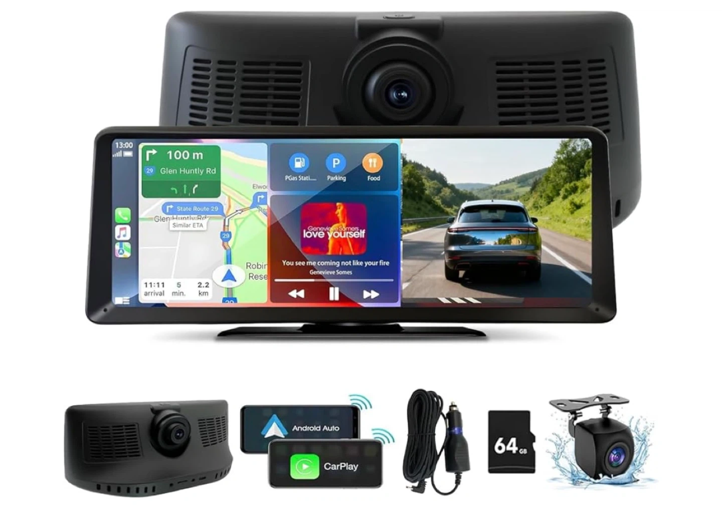 It supports both Android Auto and CarPlay, so you can easily integrate your smartphone. Includes a 64GB SD card for recording