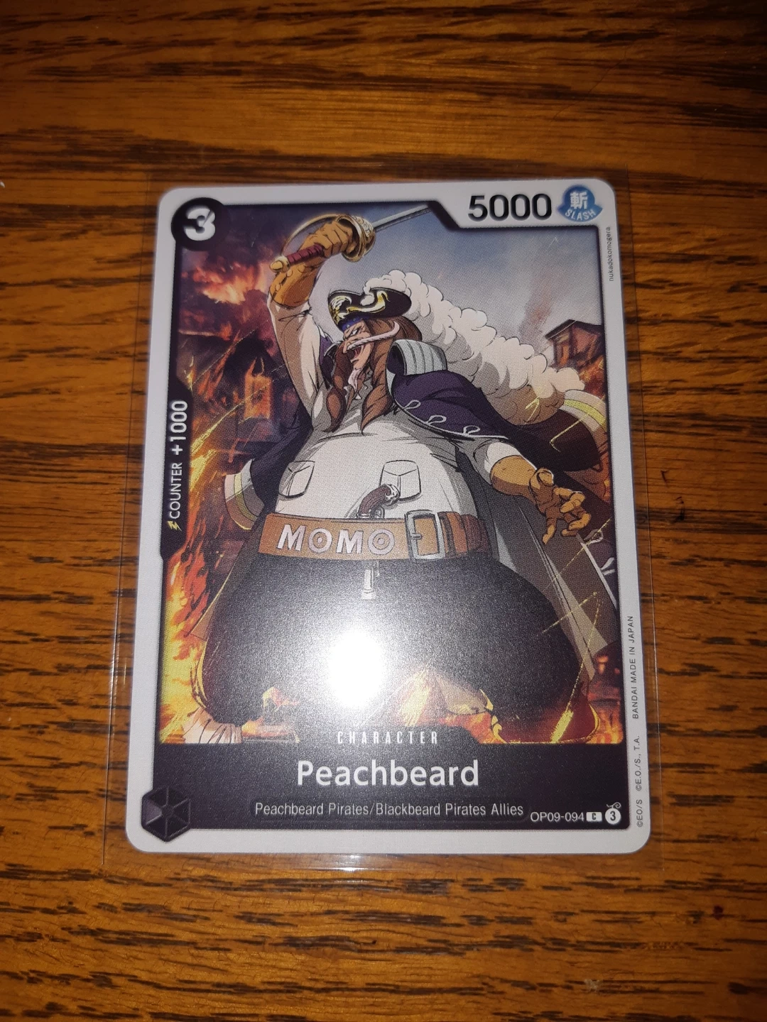 Selling a Peachbeard card from the One Piece Card Game! It's a character card, specifically Peachbeard/Blackbeard Pirates Allies with the code OP09-094. It has a counter of +1000 and a power of 5000.
