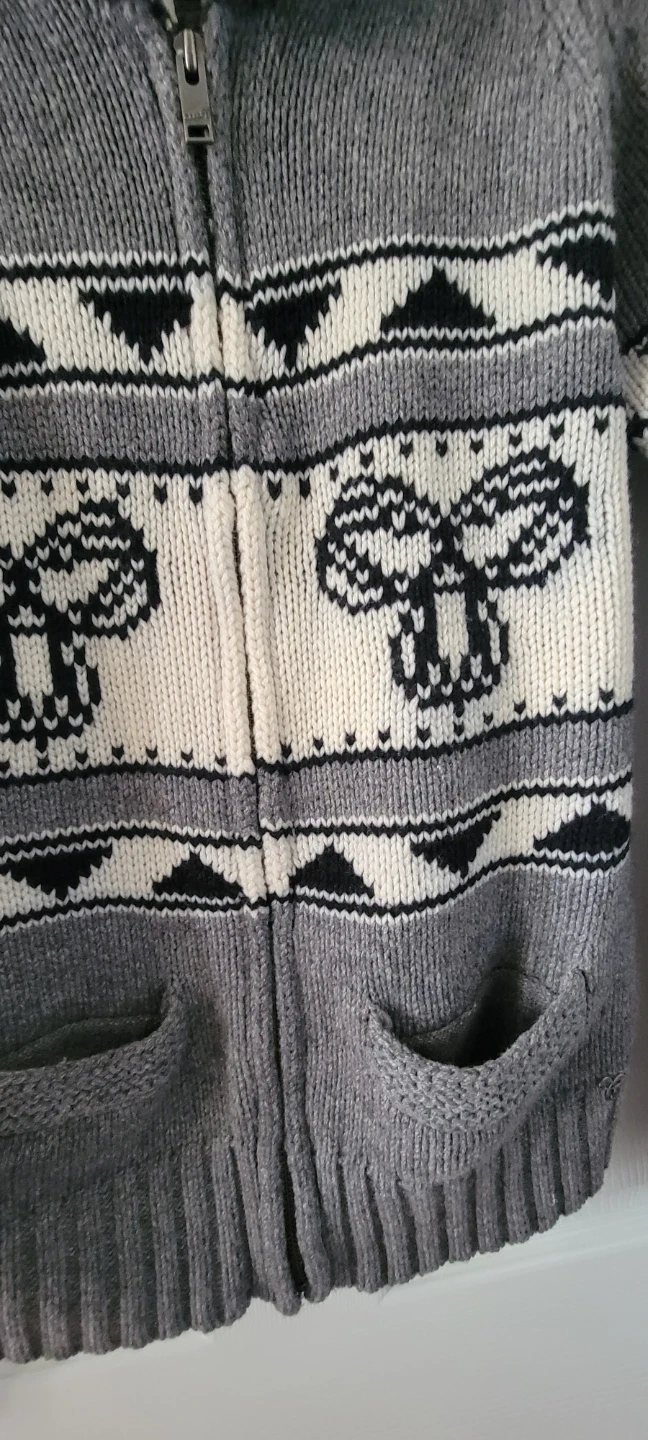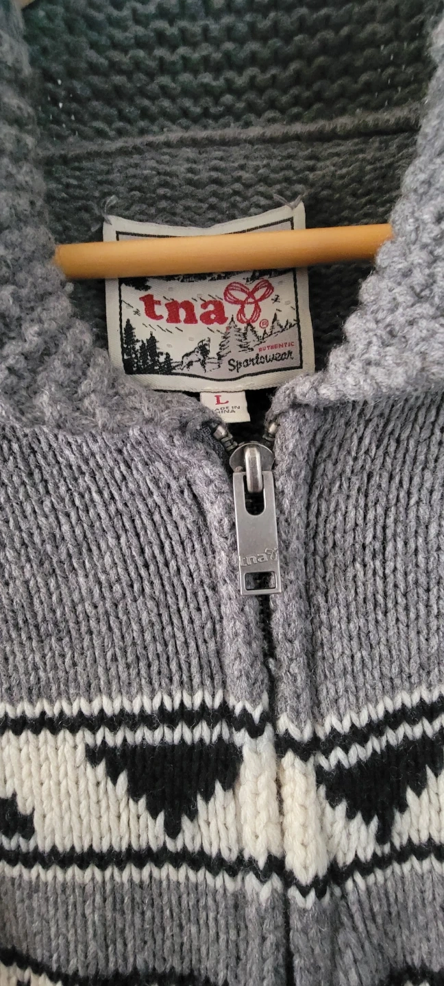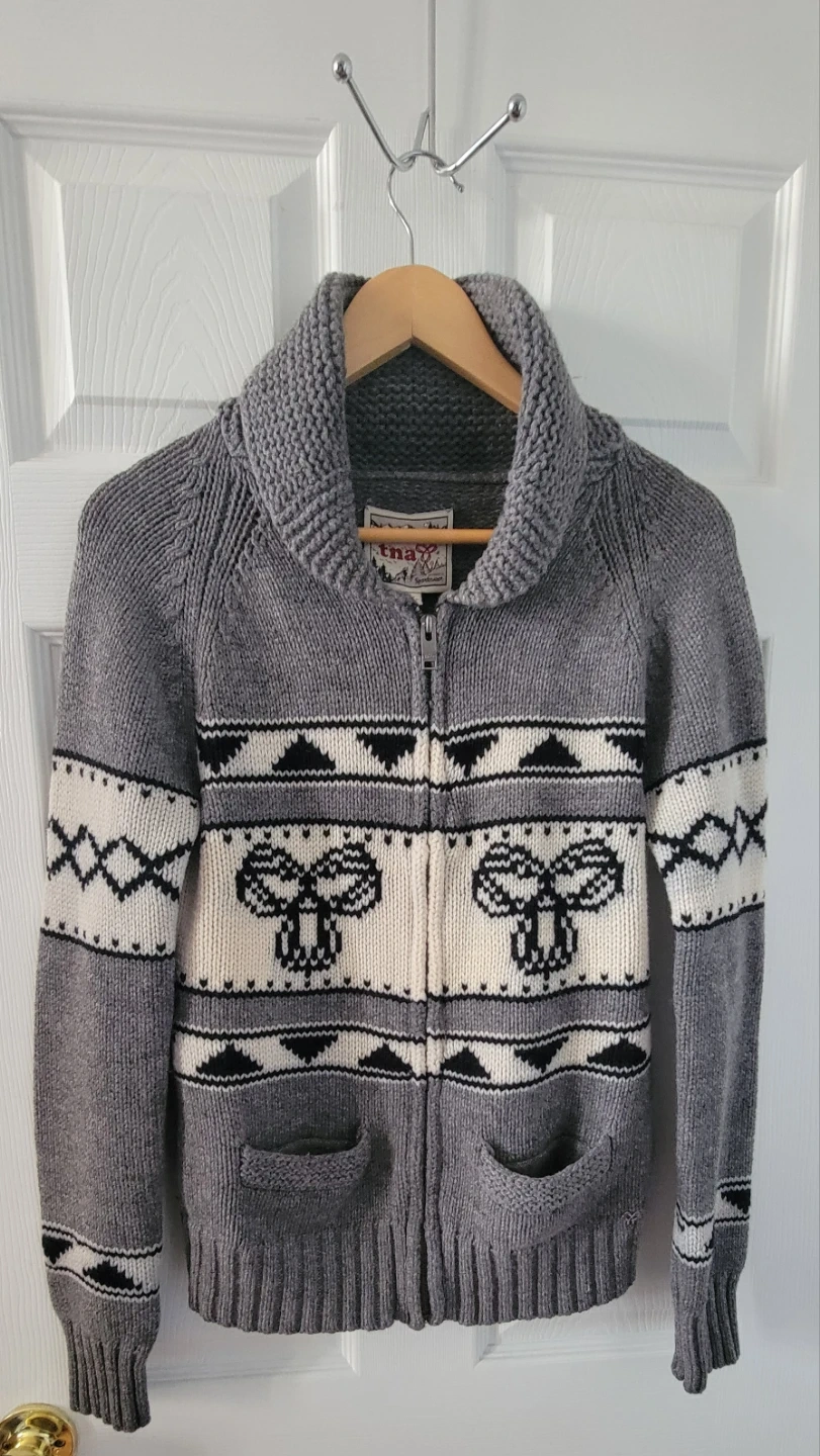 Selling a cozy TNA Spartawear zip-up cardigan in grey! It features a unique pattern and is a size large. Perfect for layering during the cooler months