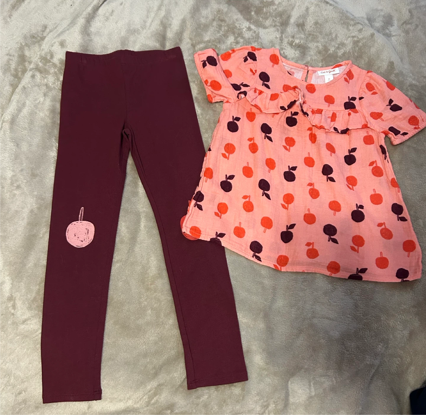 Cute Cat & Jack outfit for girls, size 5T. Includes a pink apple print top and maroon leggings with an apple detail on the knee. Perfect for your little one!