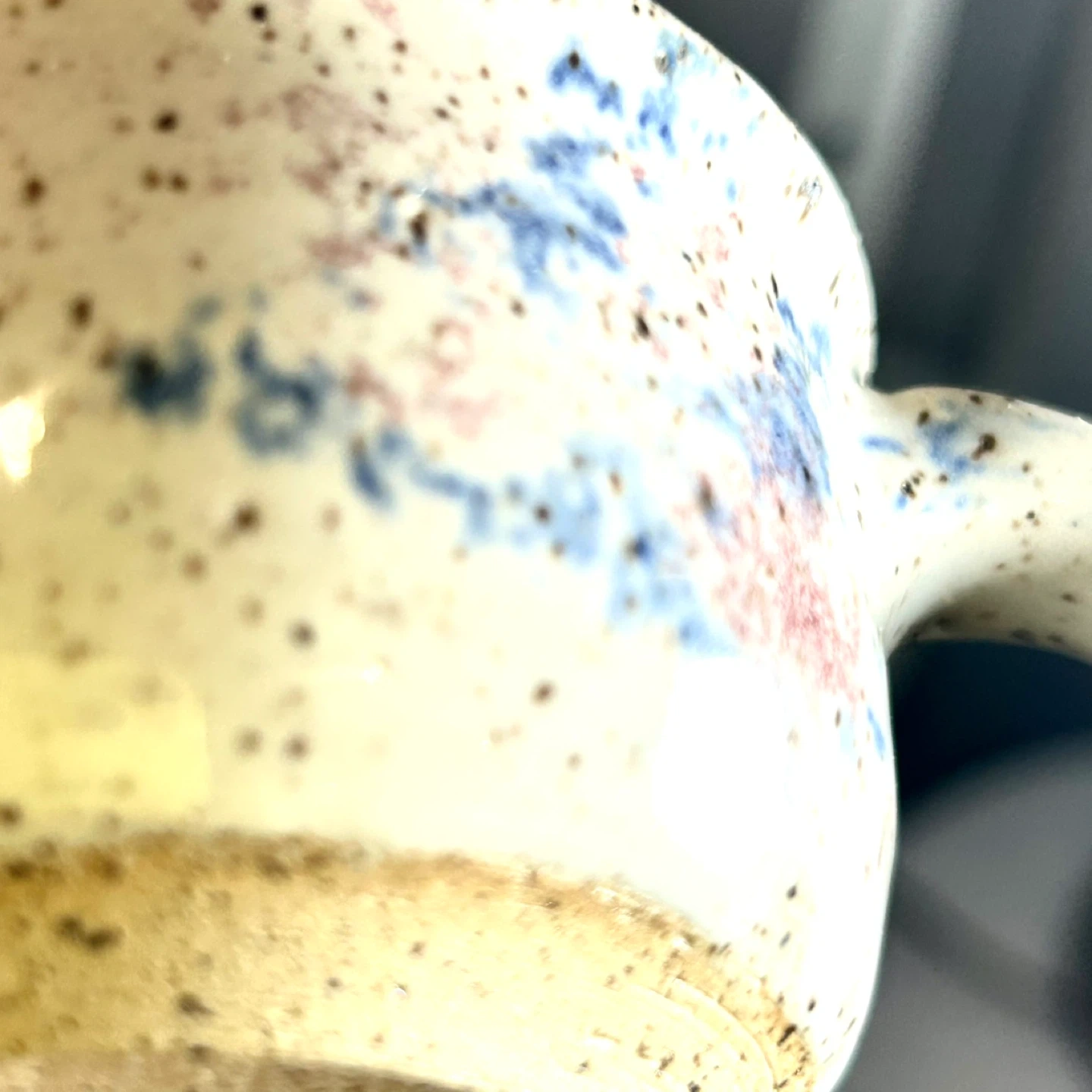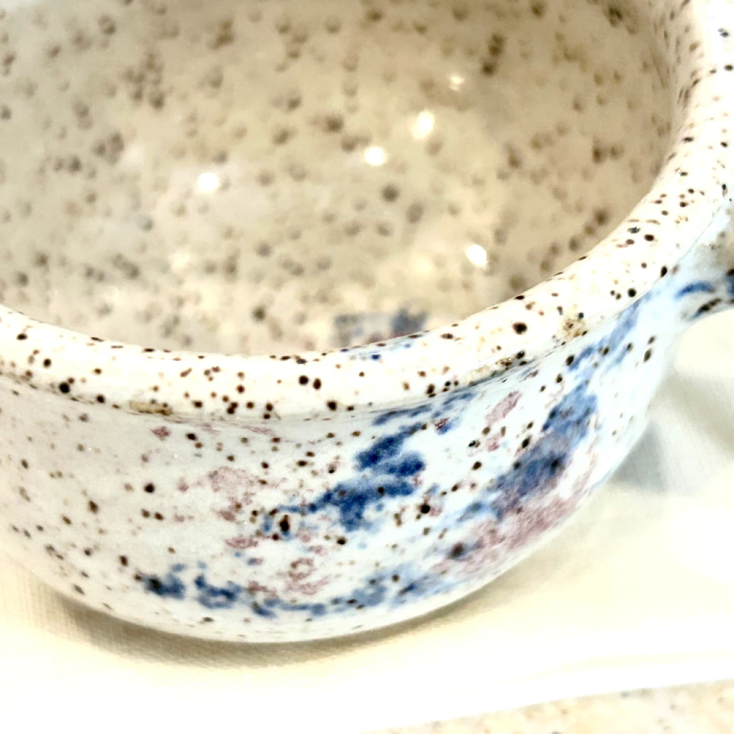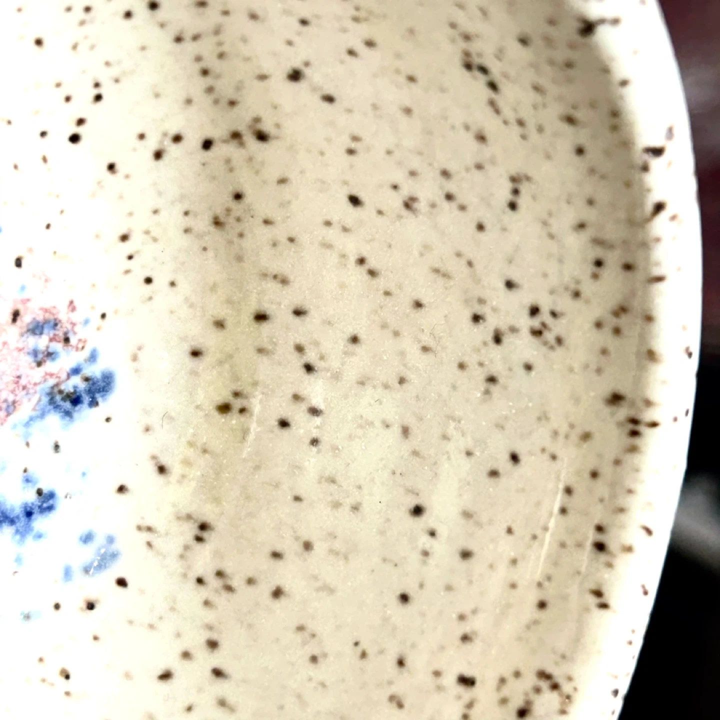 Offered is a hand-thrown, signed studio pottery espresso / demitasse cup, featuring a distinctive cream stoneware body with iron speckling and expressive cobalt blue and iron-oxide brush accents. This is a one-of-a-kind artisan piece, not mass-produced.