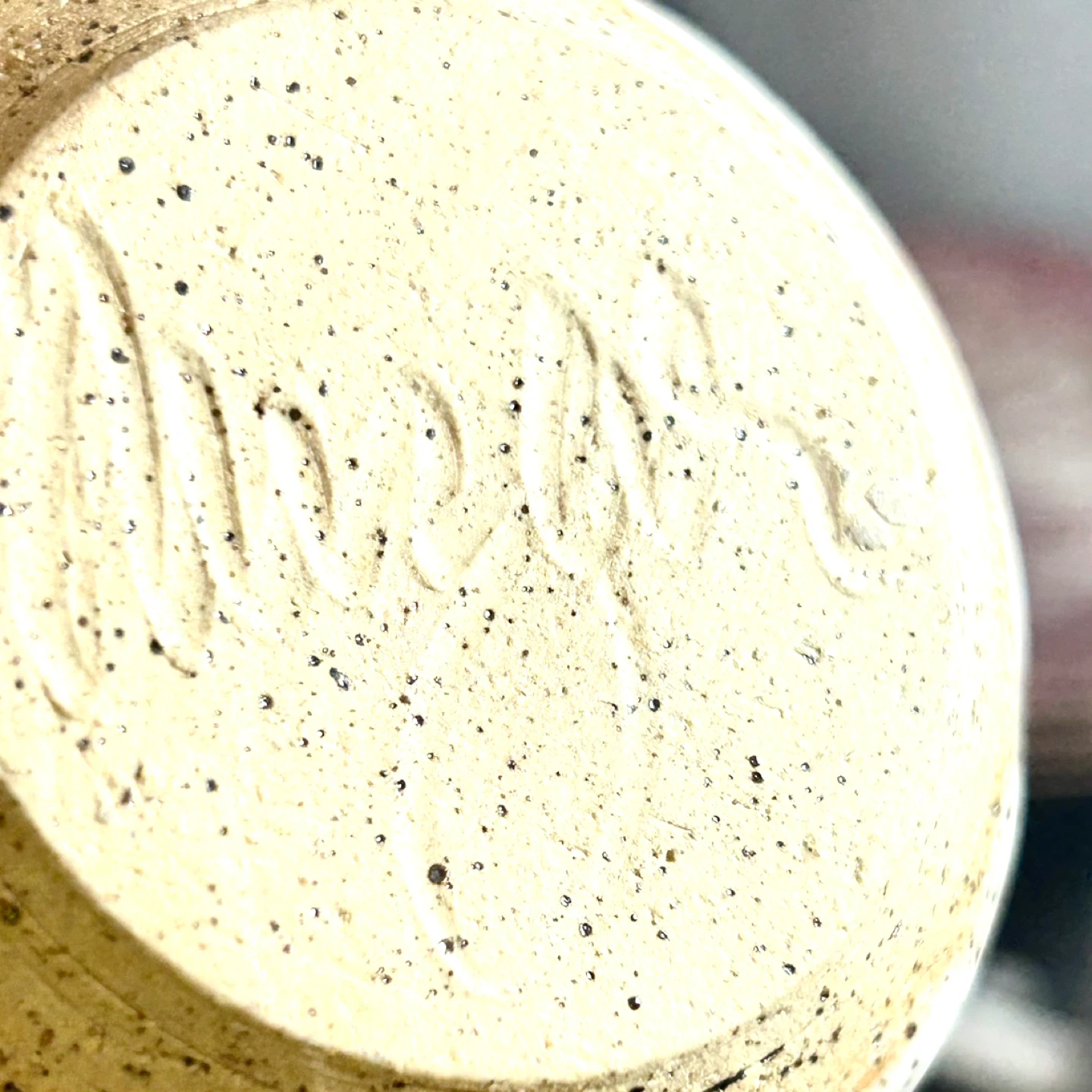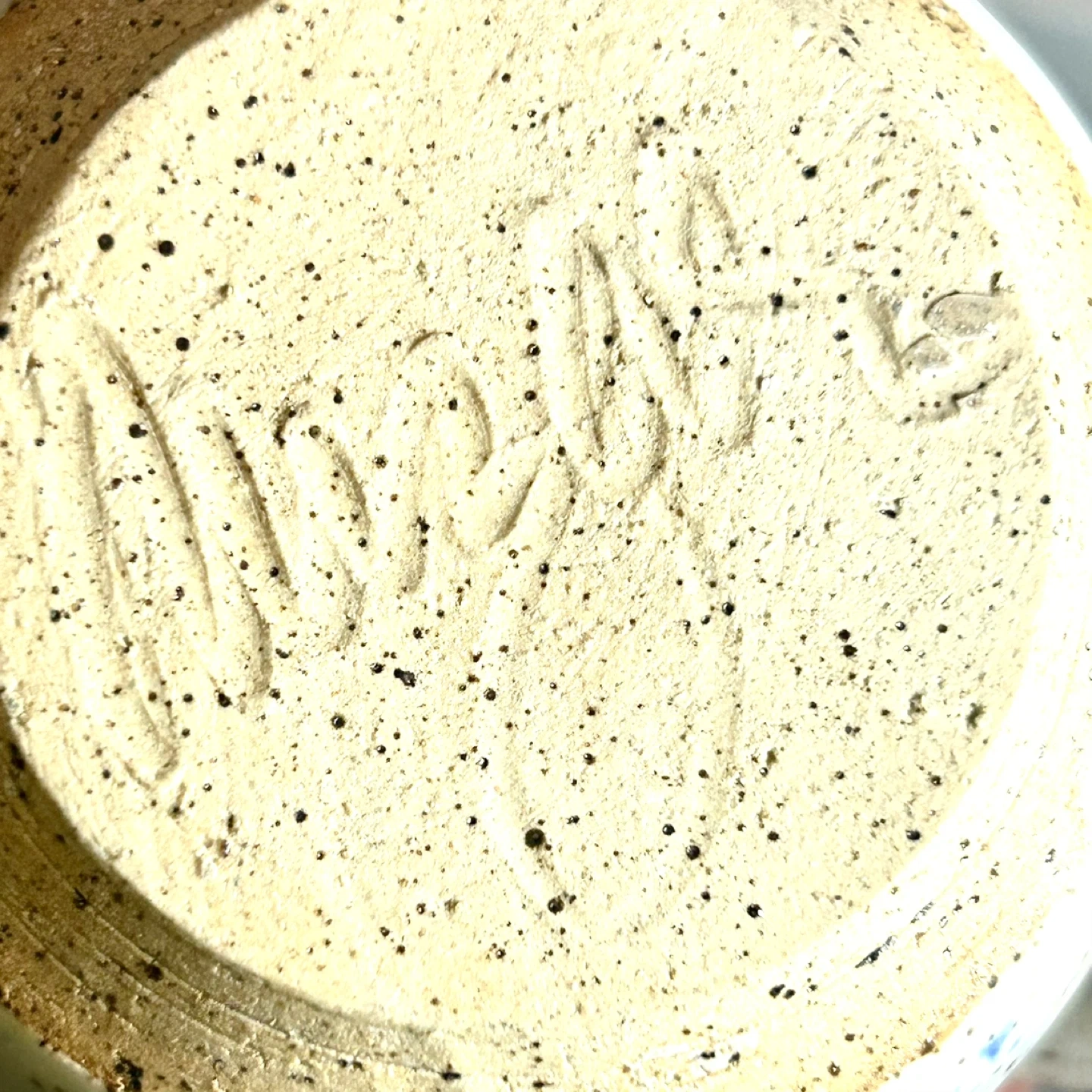 The base is clearly hand-signed with what appears to read “McDan” (or similar—signature remains open to interpretation). The mark is incised into the clay prior to firing, a standard practice among independent studio potters. No factory stamps or commercial marks are present.