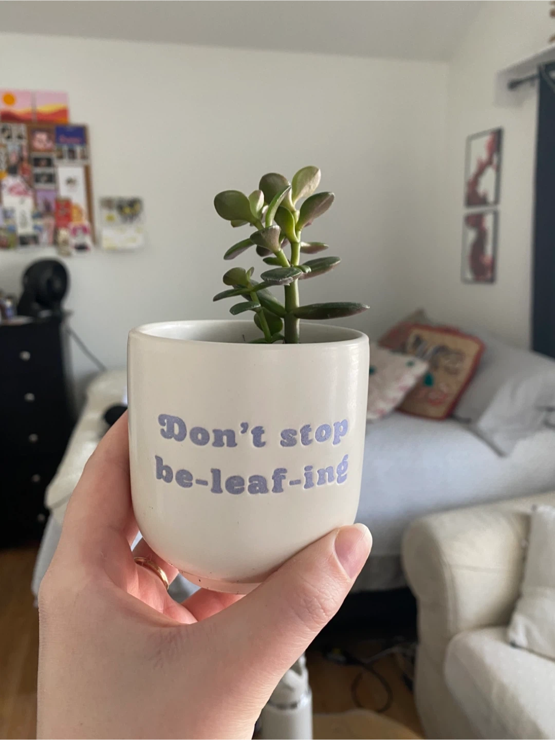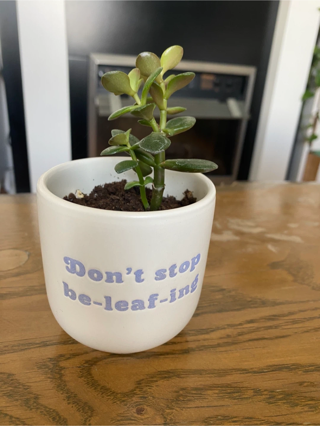 Healthy, baby Jade plant in adorable plant pot! It's in great condition and features the cute saying 'Don't stop be-leaf-ing' .