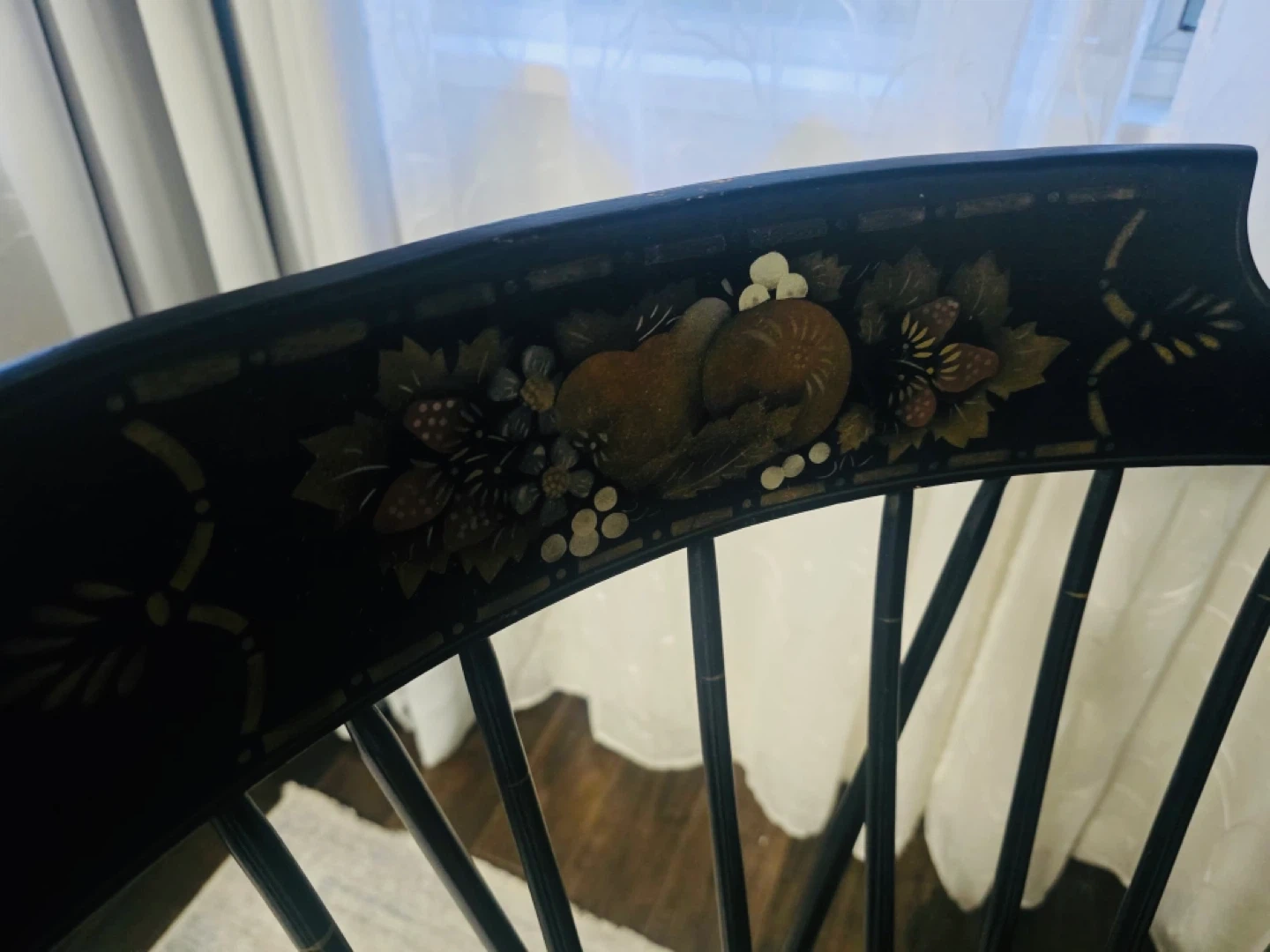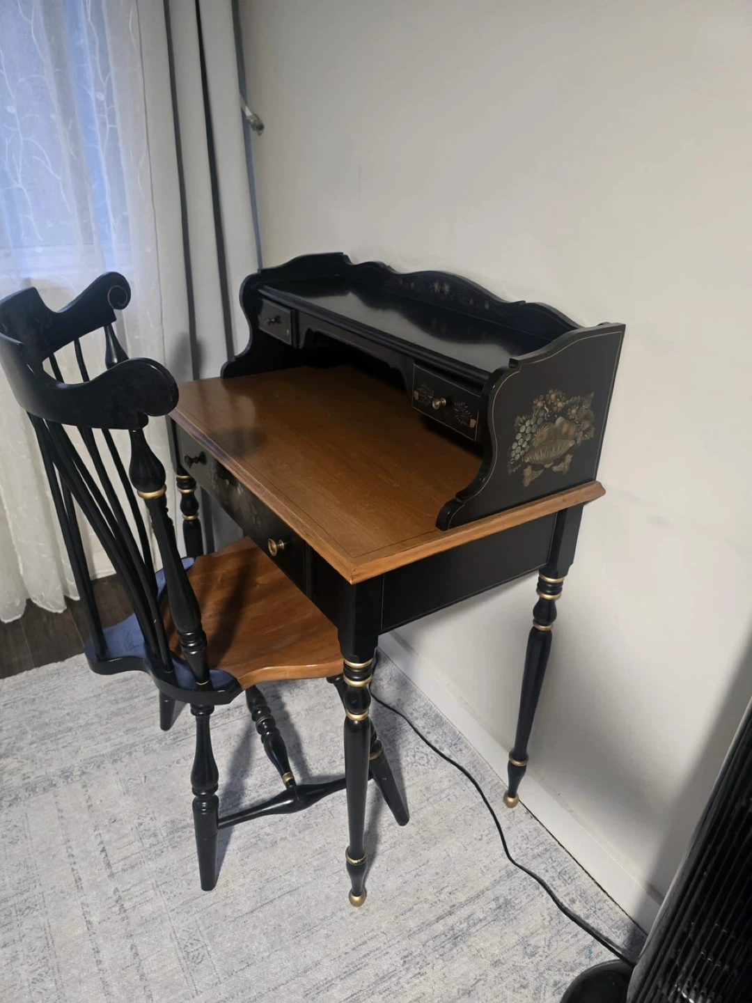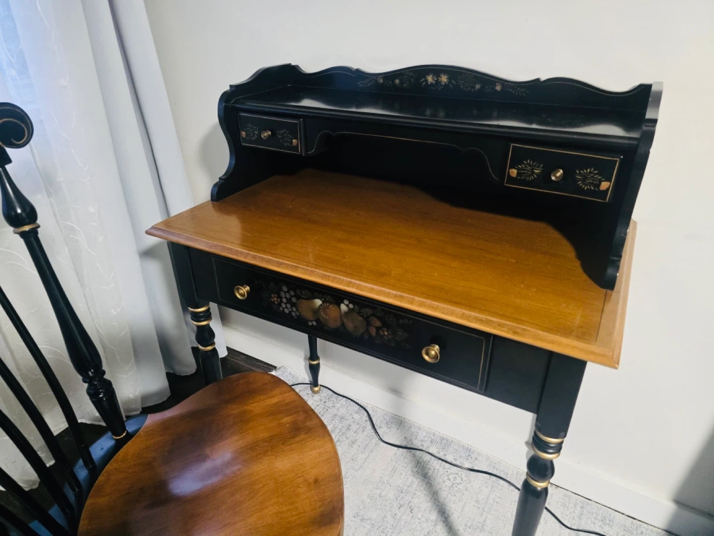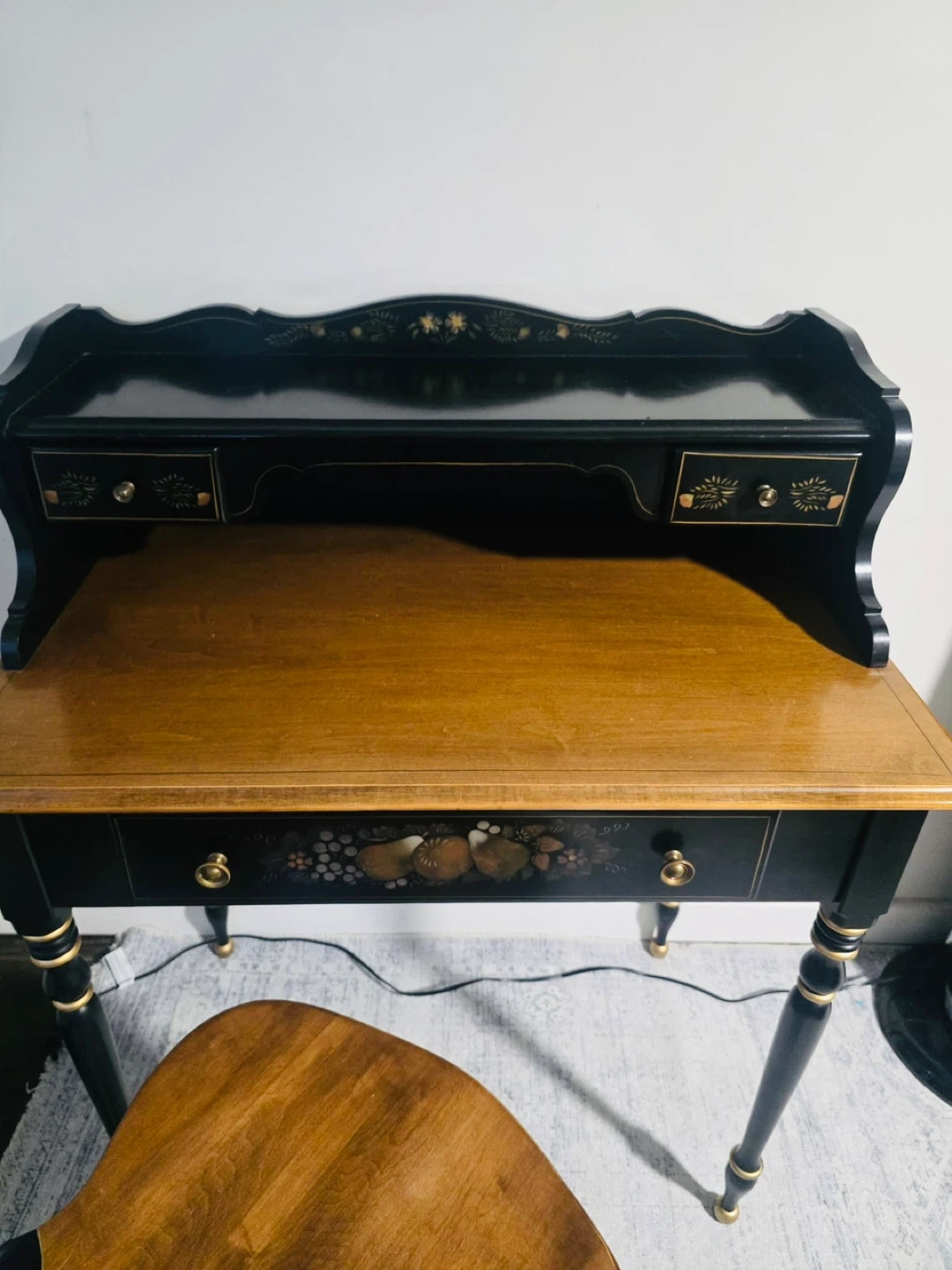A refined vintage writing desk with matching chair, featuring hand-painted decorative details, a rich black finish, and warm wood surfaces. This is a beautifully proportioned, character-filled piece that elevates any thoughtfully designed space.