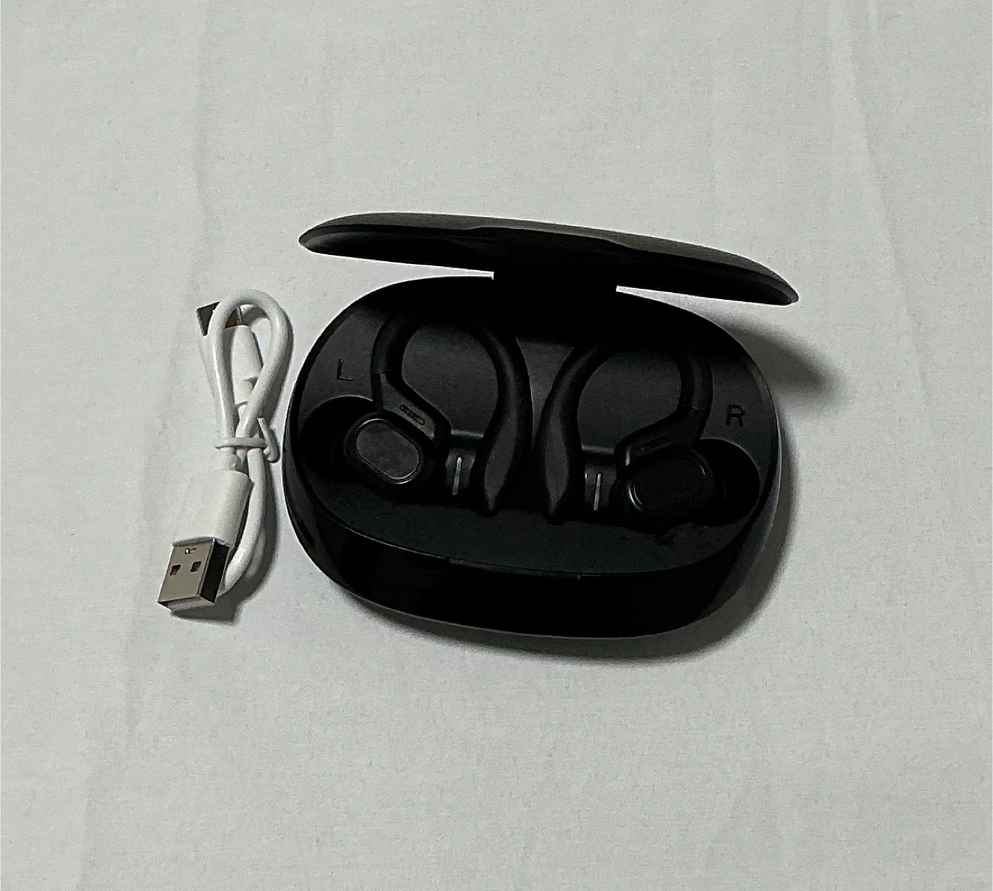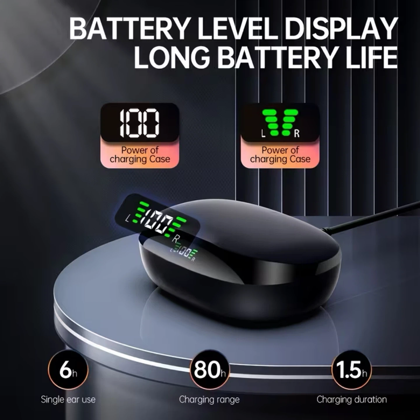 Selling a pair of wireless Bluetooth earbuds in black. They feature a charging case with a battery level display and come with a user manual and charging cable. The earbuds offer 6 hours of single ear use and have an 80-hour charging range. Charging duration is about 1.5 hours. Great for on-the-go listening!