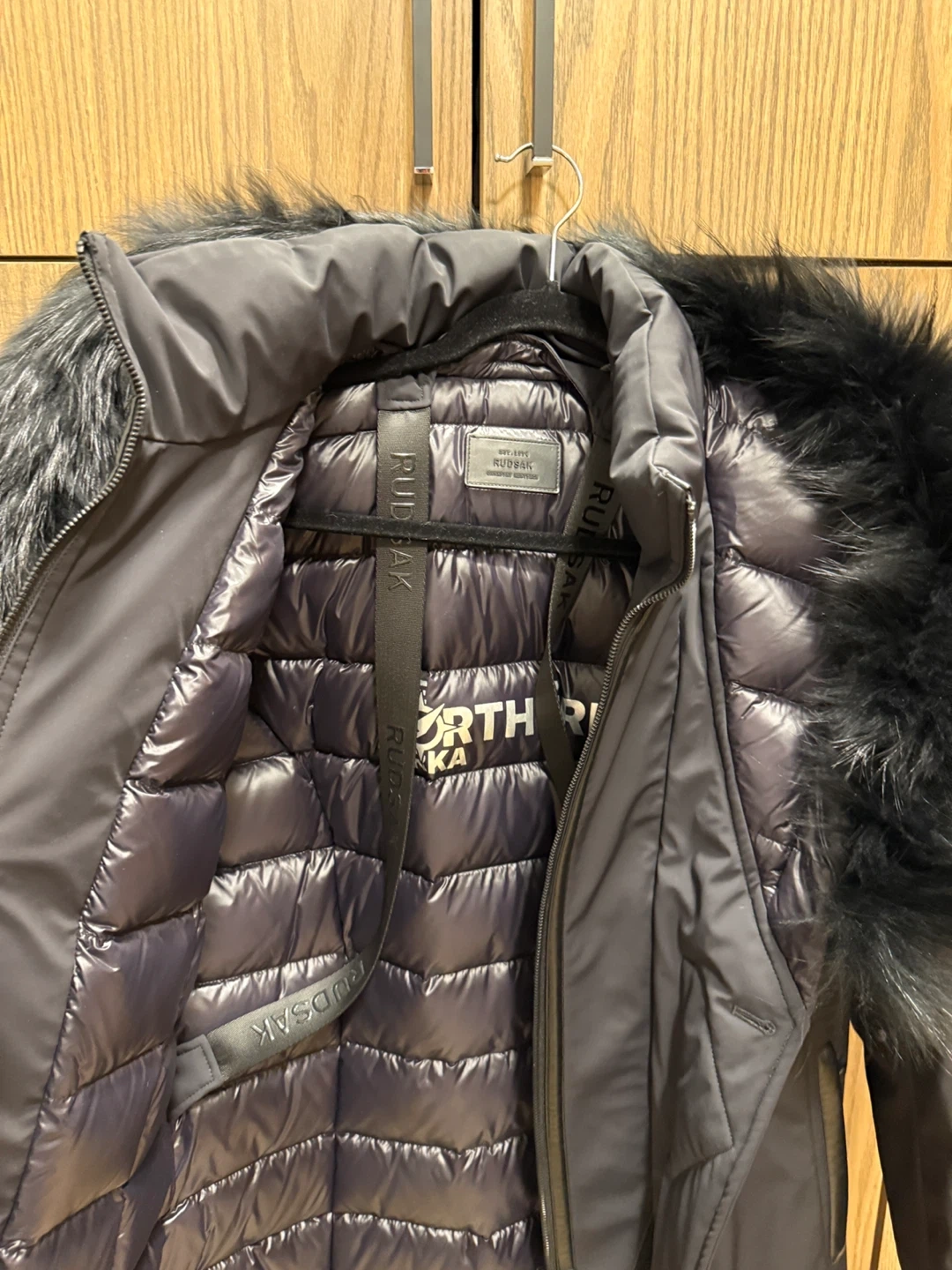 Never worn Rudsak fitted down parka, power strech shell designed for extreme conditions and coldest of days. Mid length. Fully removable fur trim, interior back pack straps, inner security pocket, storm cuffs and mesh eyelets under each arm for breathability.