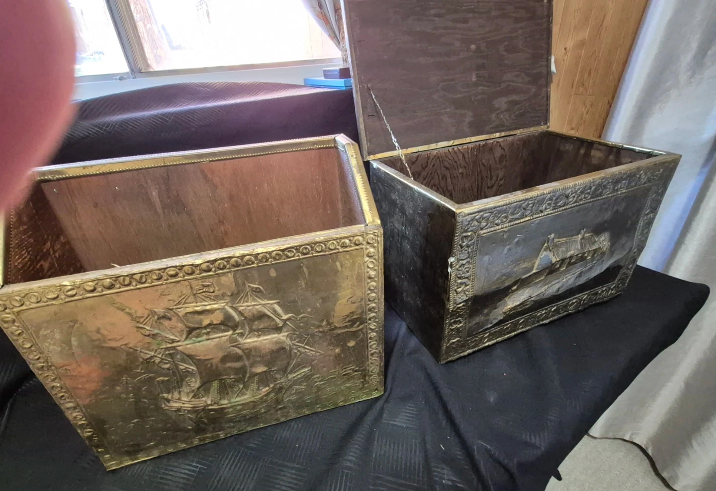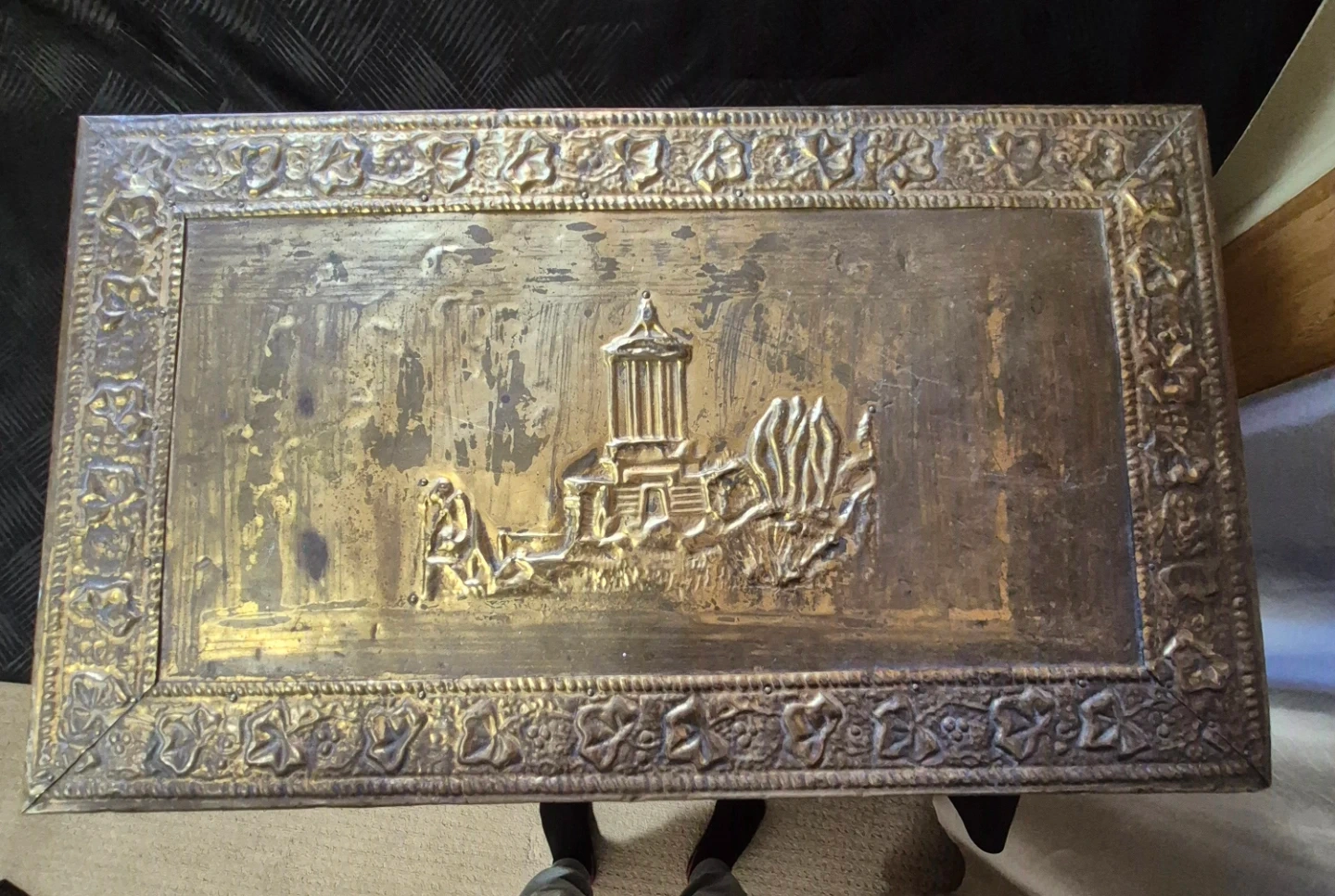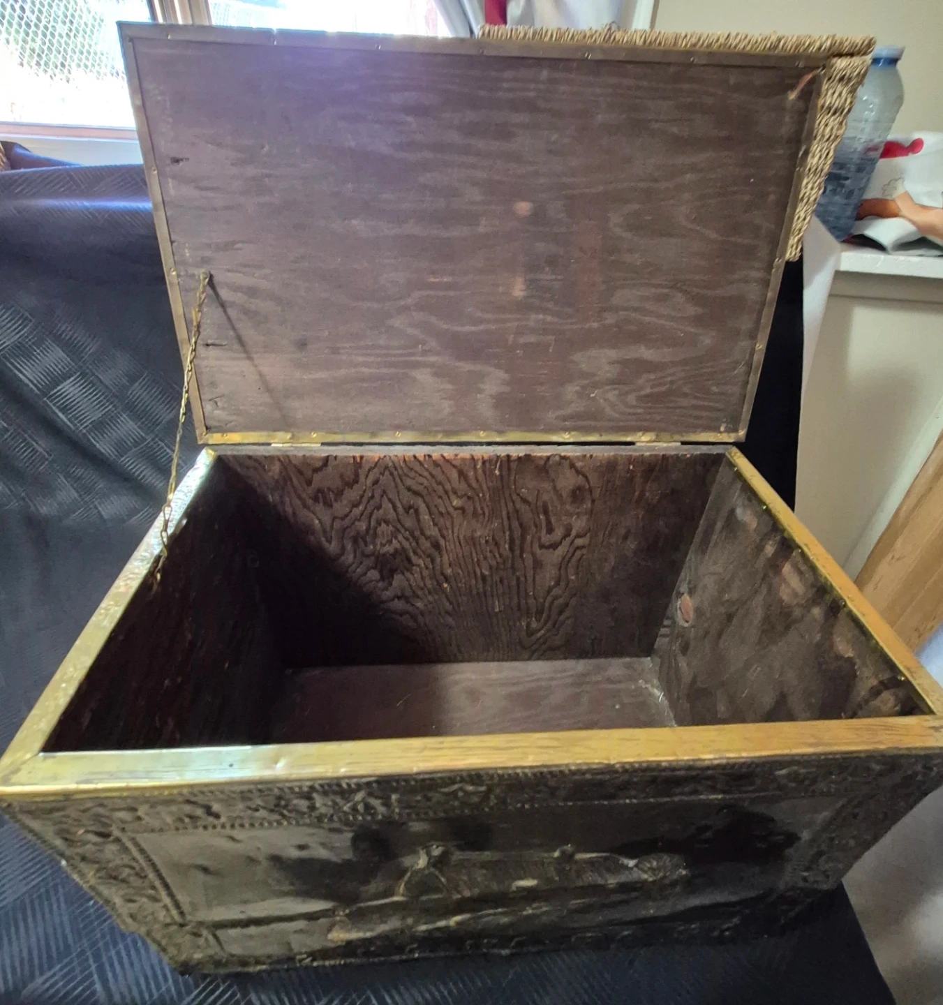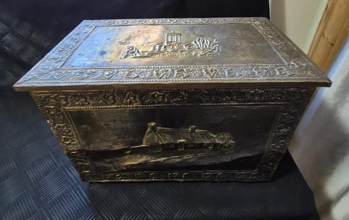 Selling a vintage brass embossed storage trunk. It has a unique design with embossed images. The trunk is in used condition. Also magazine holder.