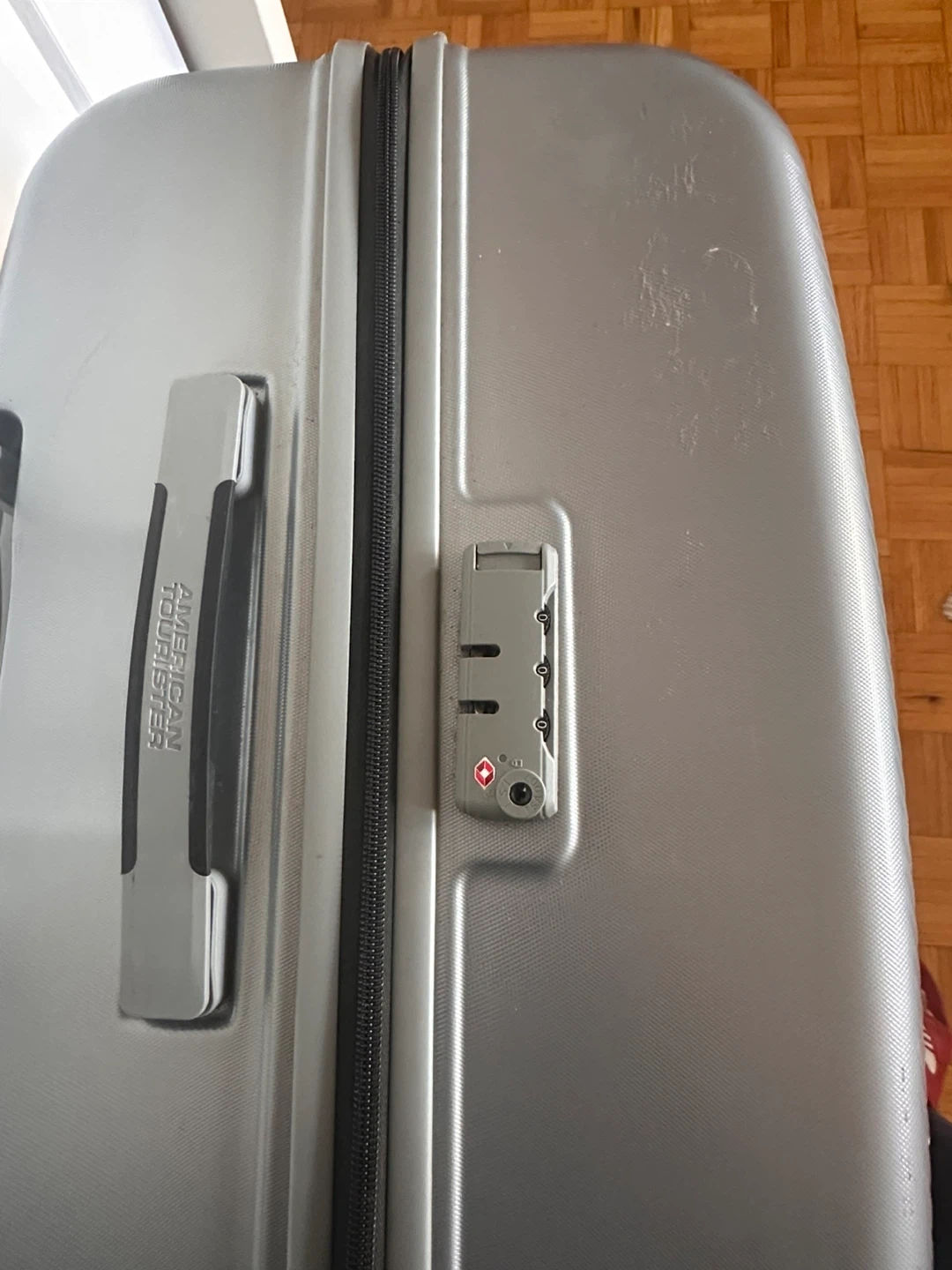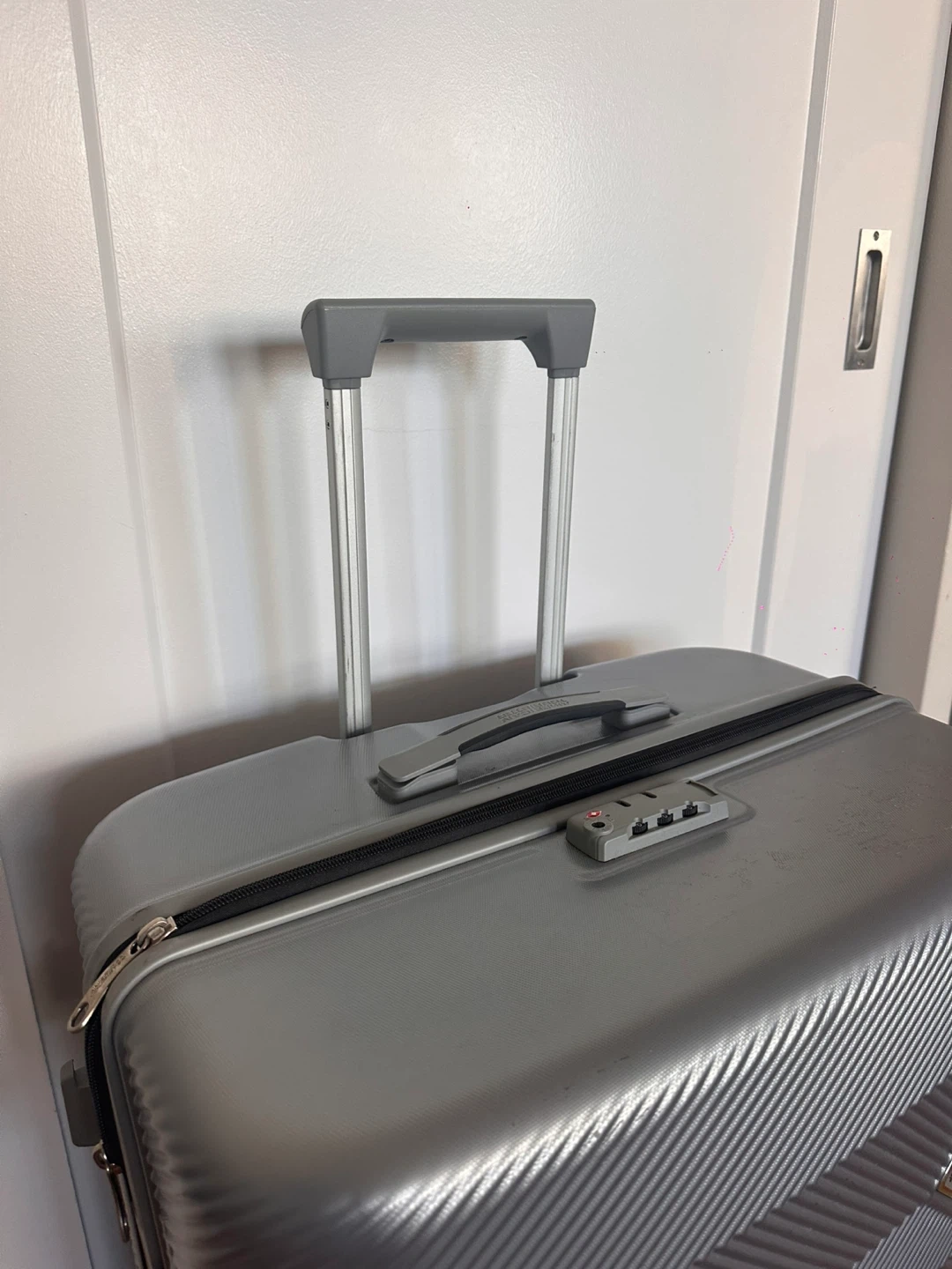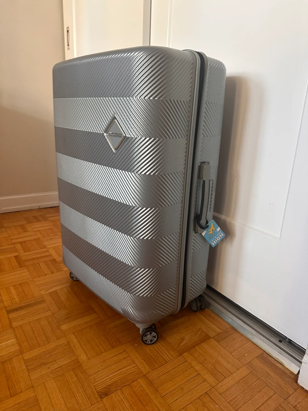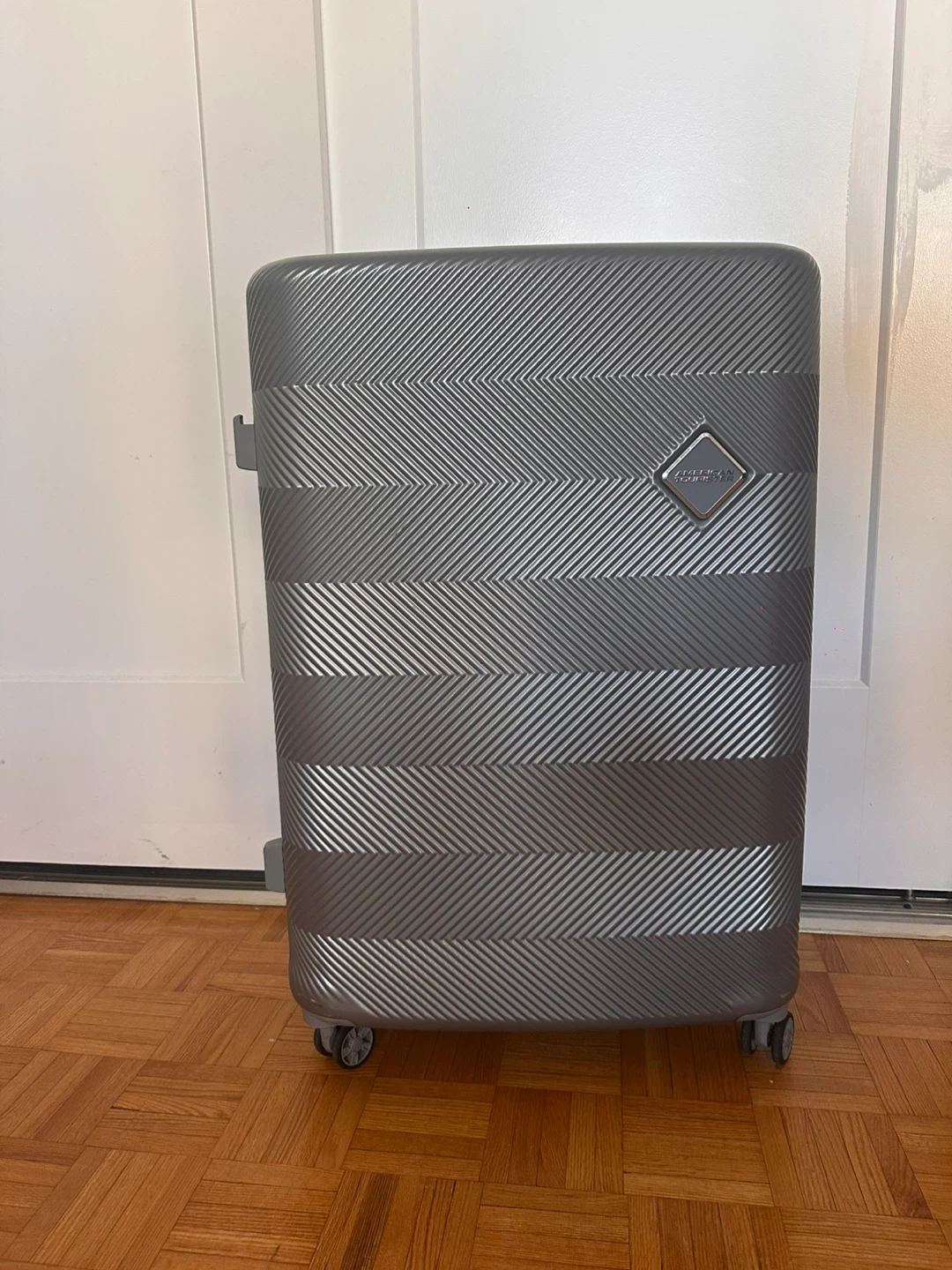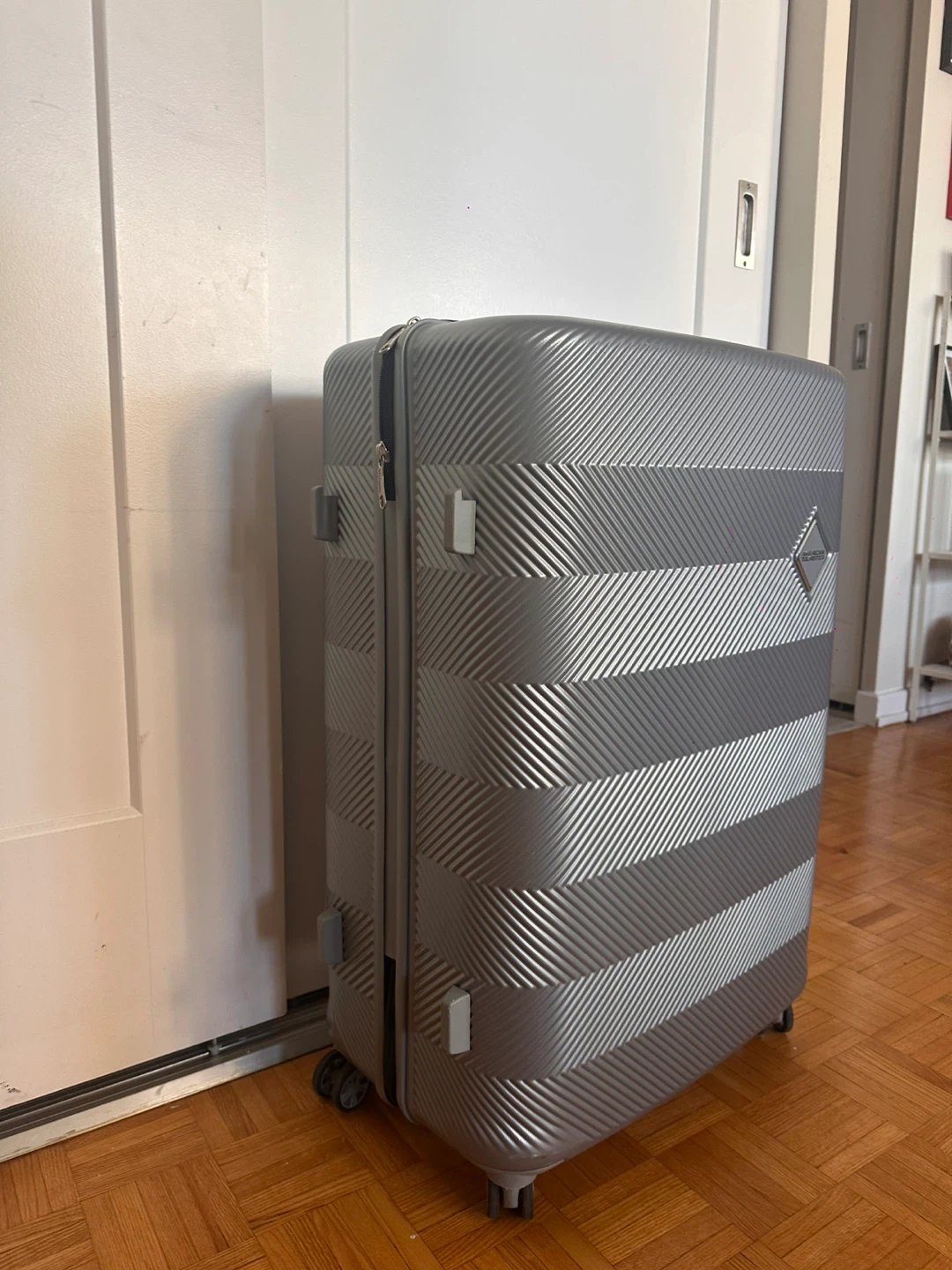 Selling a silver hardside suitcase from American Tourister. It's in great shape and ready for your next trip! The suitcase has a textured design and sturdy wheels for easy maneuvering. It's a reliable travel companion! Used in one international flight only.