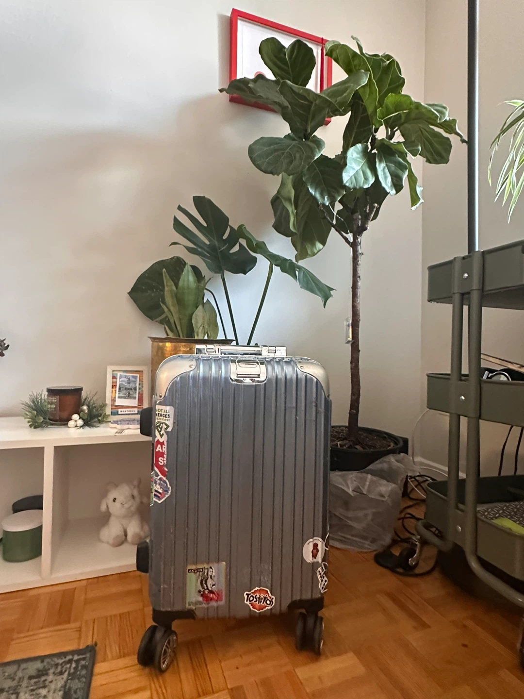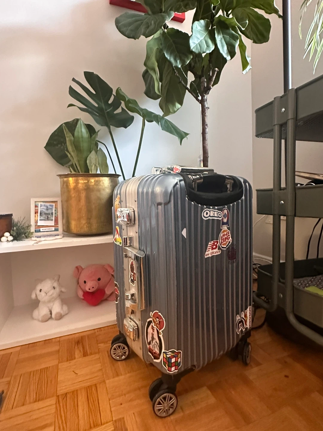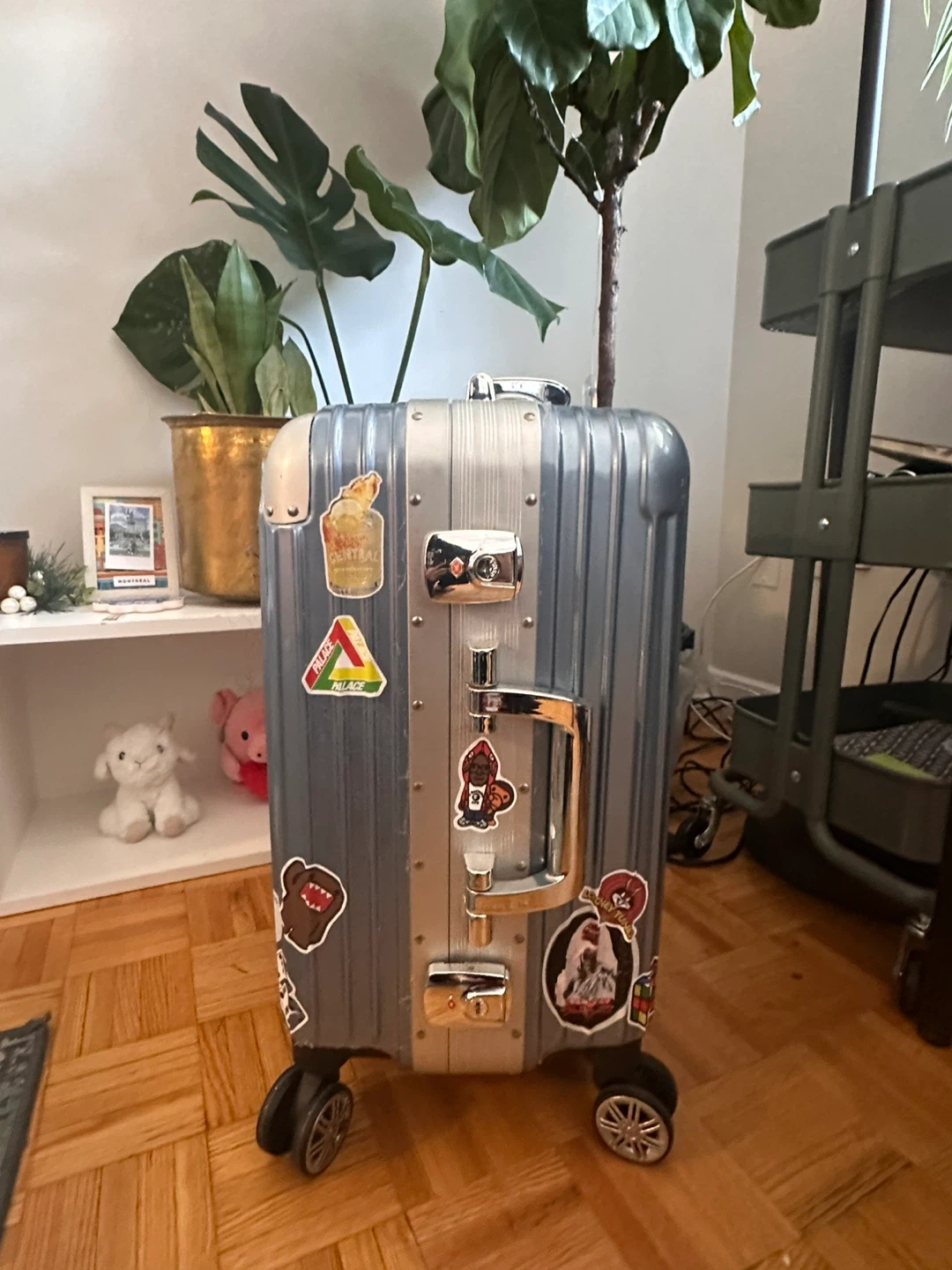 Selling a used silver suitcase that's ready for your next adventure! It's got some fun stickers on it that give it a unique look. Perfect for travel!