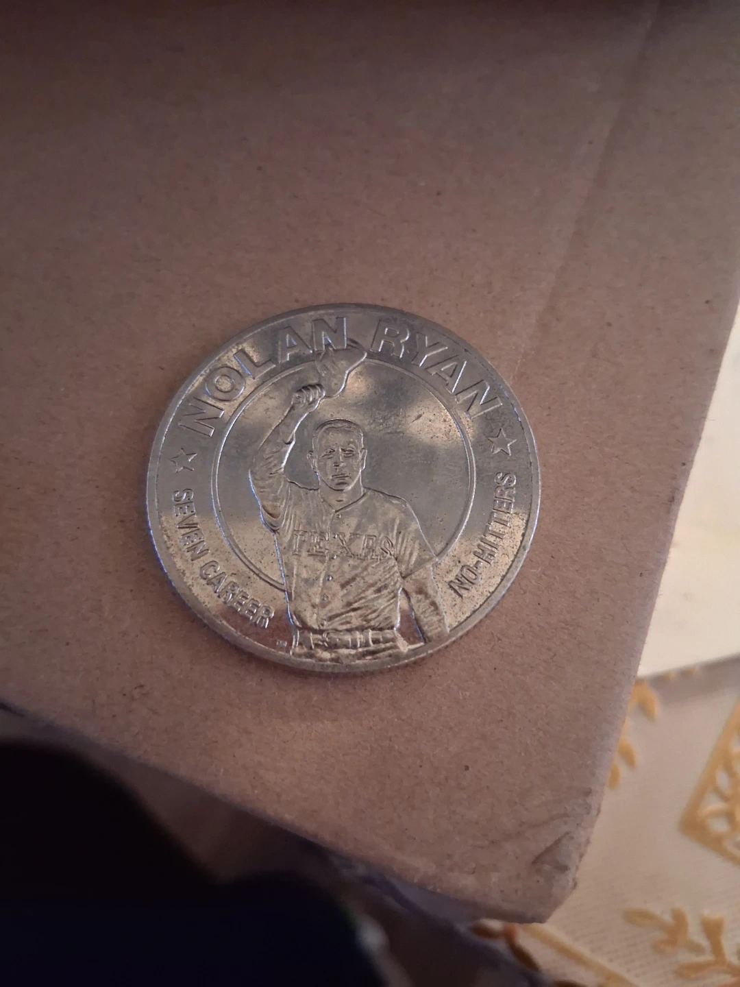 Selling a collectible Nolan Ryan coin commemorating his seven career no-hitters. It features an image of Nolan Ryan in his Texas Rangers uniform. Great for any baseball fan or collector! Make me an off come on fans