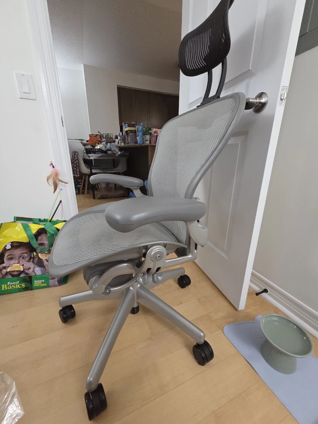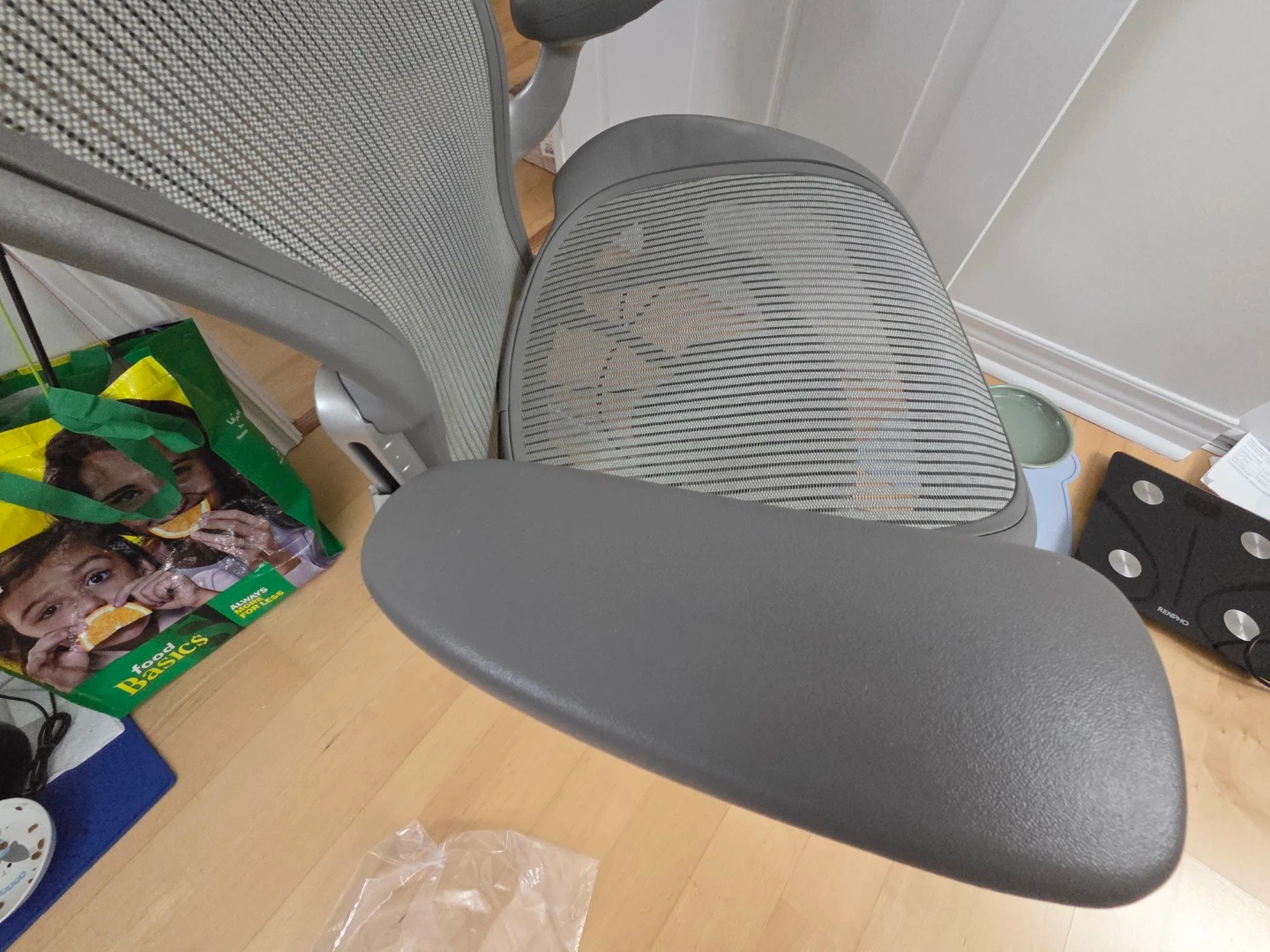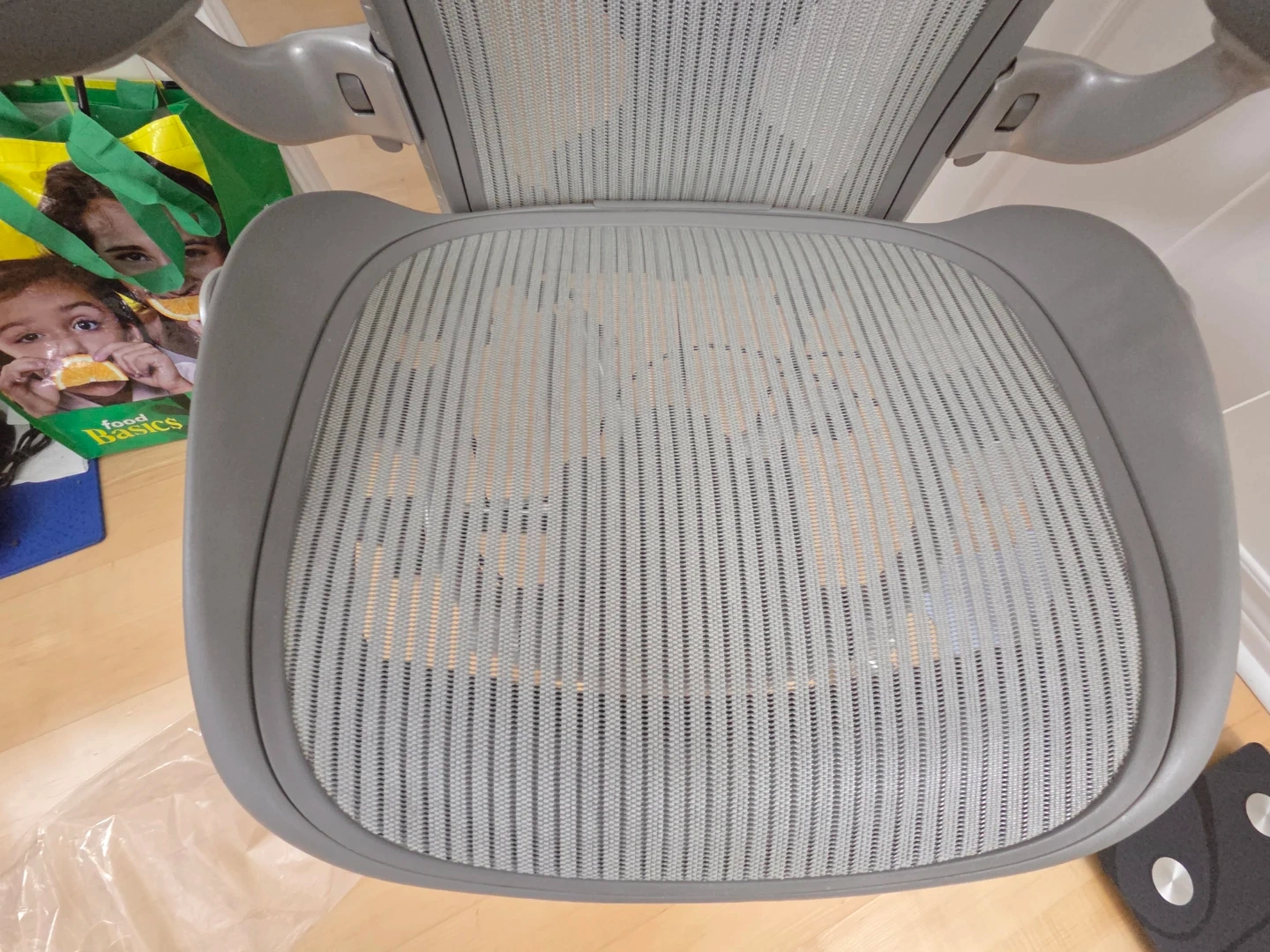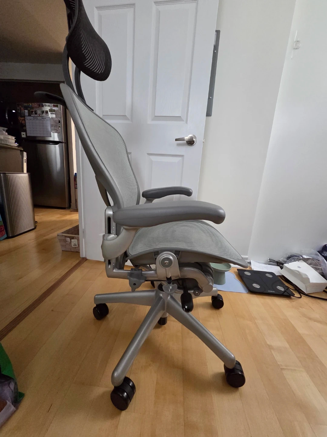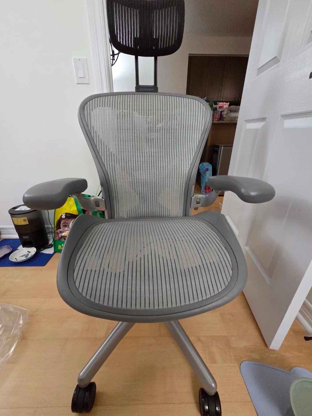 Selling a Herman Miller Aeron office chair in grey. It's in great shape and ready for a new workspace! Perfect for long hours of work or study, this chair provides excellent support and comfort.