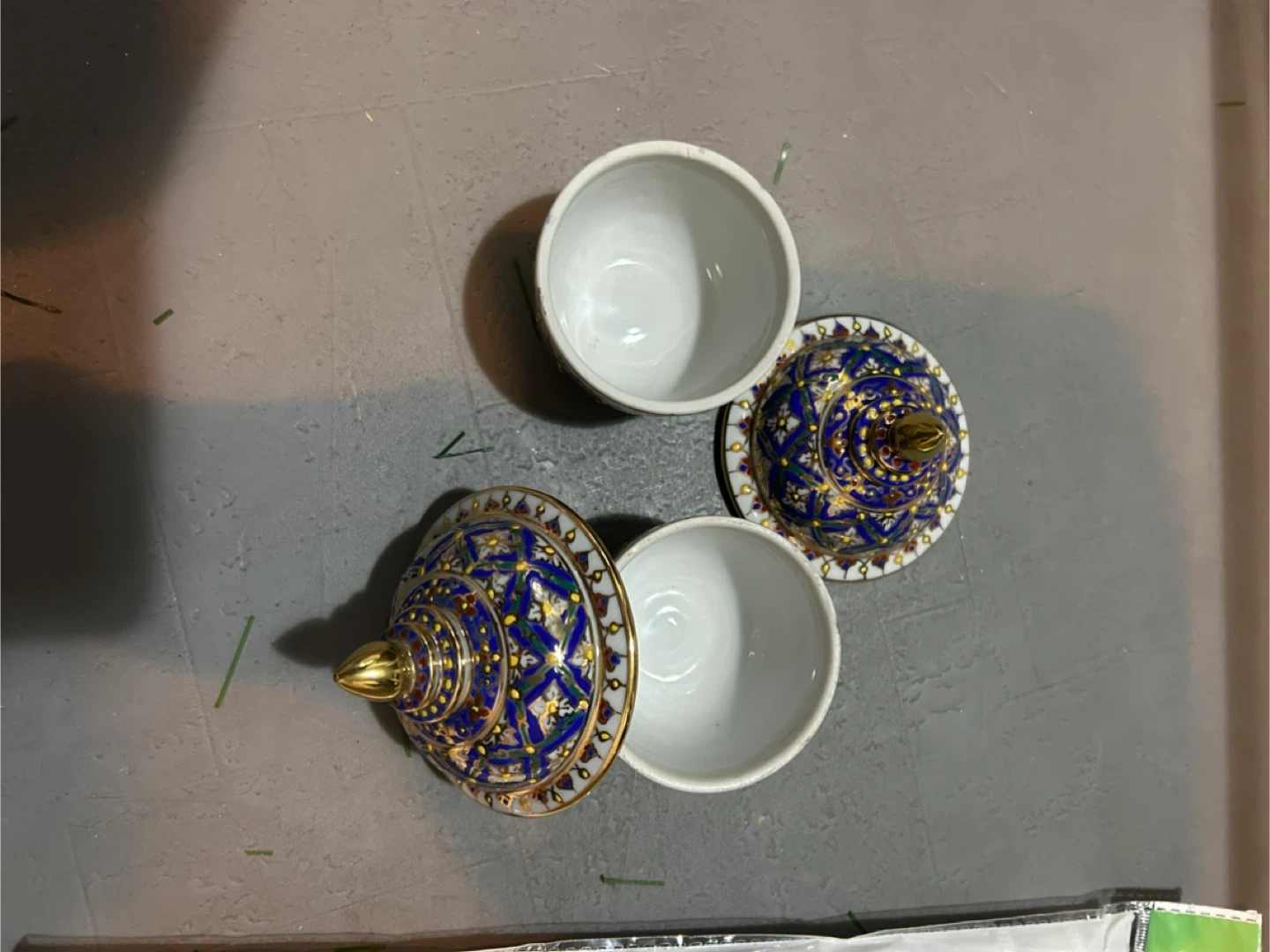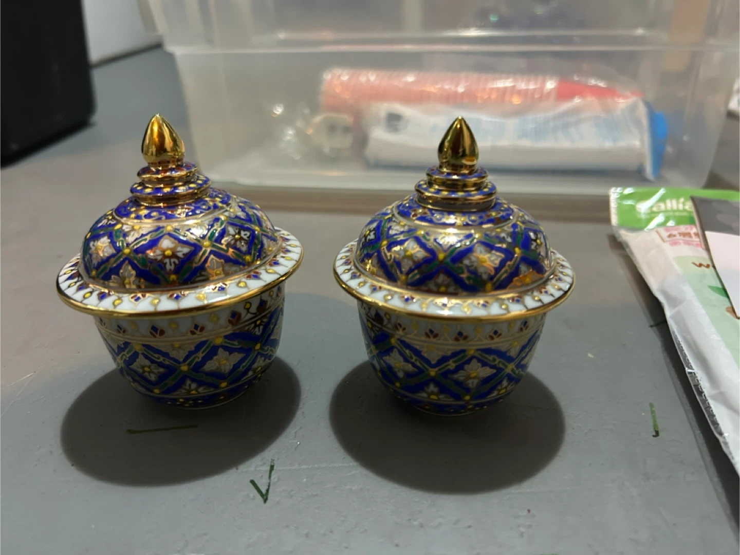 Selling a pair of lovely vintage Benjarong porcelain bowls. These bowls feature intricate designs in blue, white, and L gold. Great for decor!