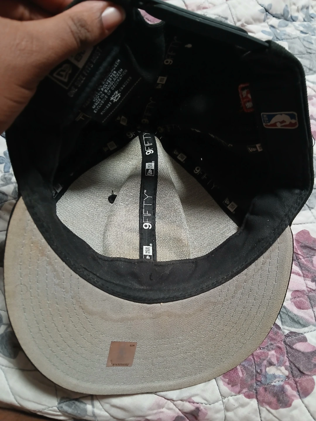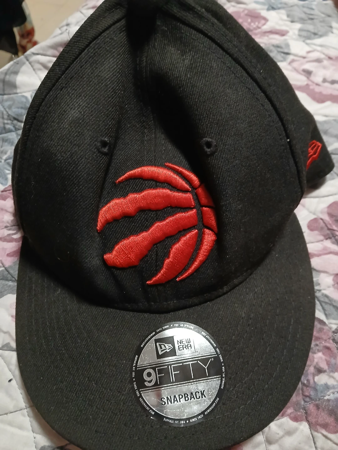 Selling a New Era 9FIFTY snapback hat featuring the Toronto Raptors logo. It's black with a red logo. It's in used condition, as seen in the photos. Price is firm plz. Pick up midland and Danforth or 401 bay street
