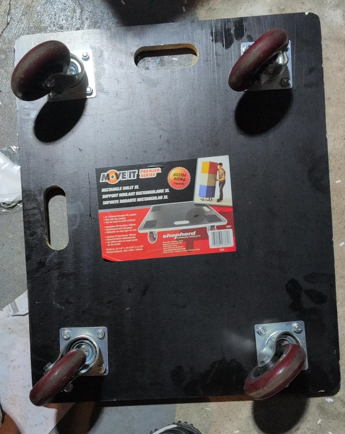 Selling a Move It Rectangle Dolly XL with Shepherd wheels. It can support up to 882 lbs. It has durable swivel PVC casters and a slip-resistant surface. Perfect for moving heavy items around the house or workspace!