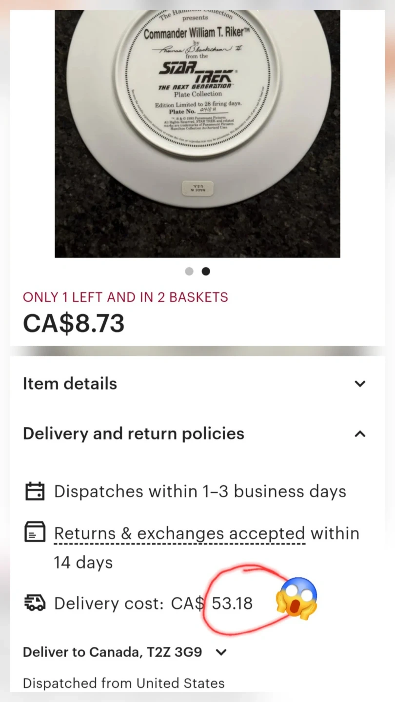 I'm selling this for the average current selling price on online platforms such as Etsy and ebay. (Minus the shipping and 23% duty!) I thought I found a $9 deal, then I saw that shipping was $54!