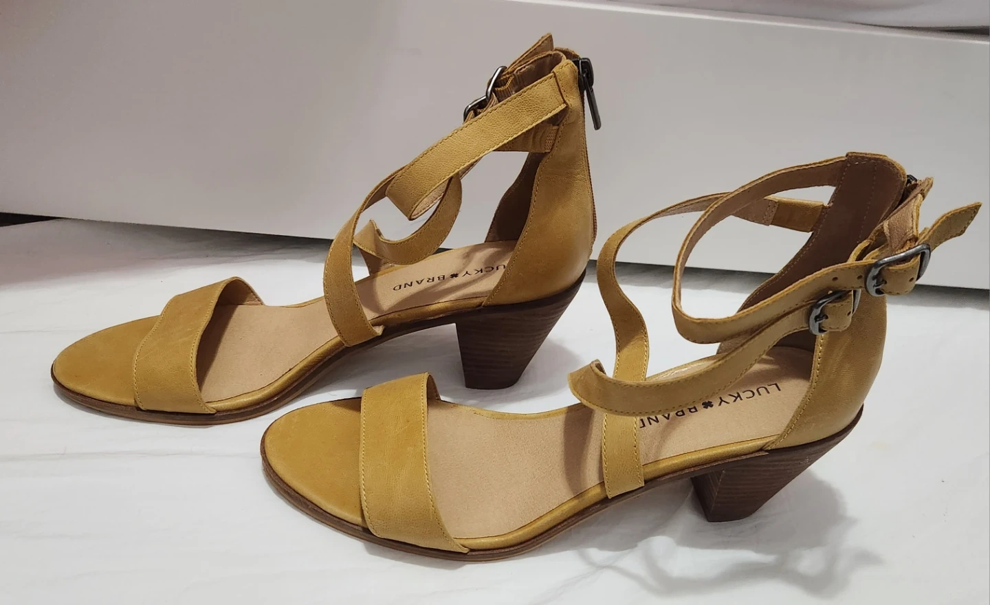 These are a pair of Lucky Brand sandals in a lovely yellow colour. They feature an ankle strap design and a small heel. Perfect for adding a touch of style to your summer outfits!