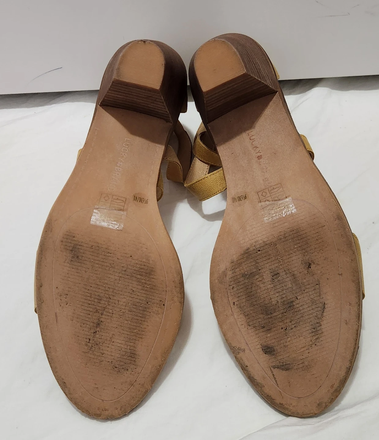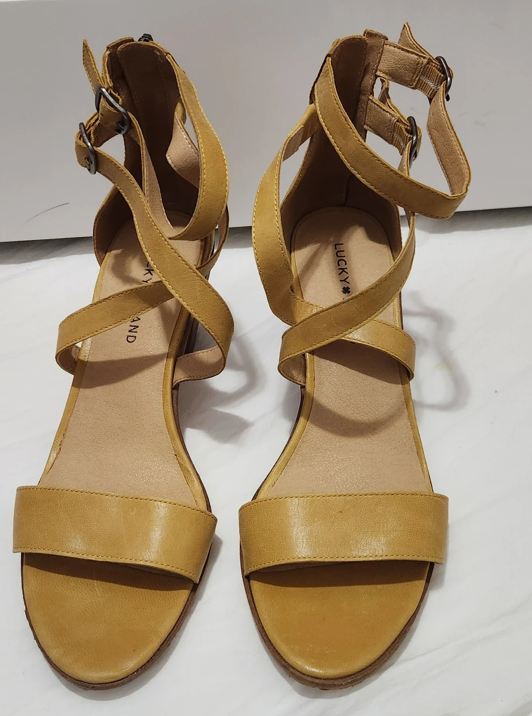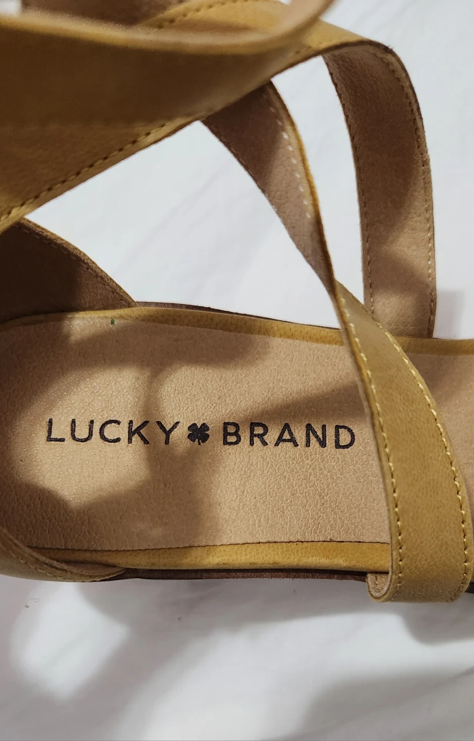 These are a pair of Lucky Brand sandals in a lovely yellow colour. They feature an ankle strap design and a small heel. Perfect for adding a touch of style to your summer outfits!