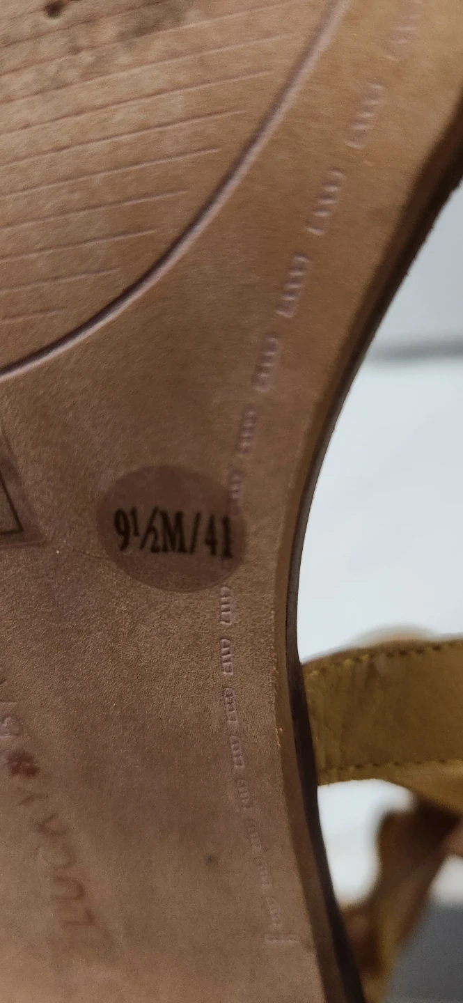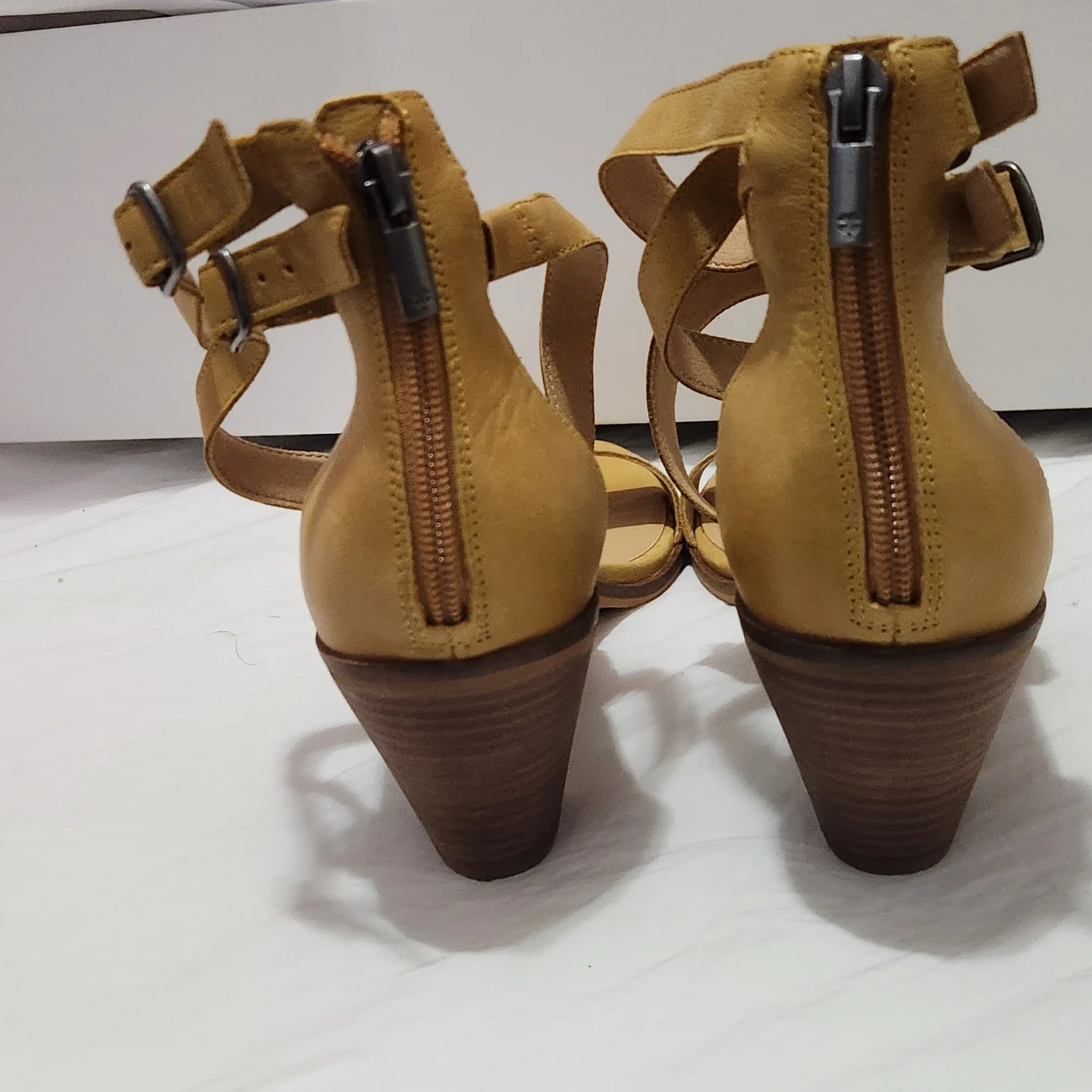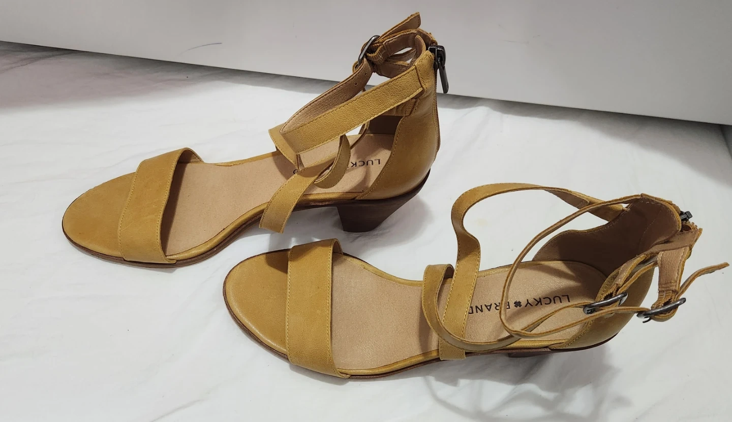 These are a pair of Lucky Brand sandals in a lovely yellow colour. They feature an ankle strap design and a small heel. Perfect for adding a touch of style to your summer outfits!