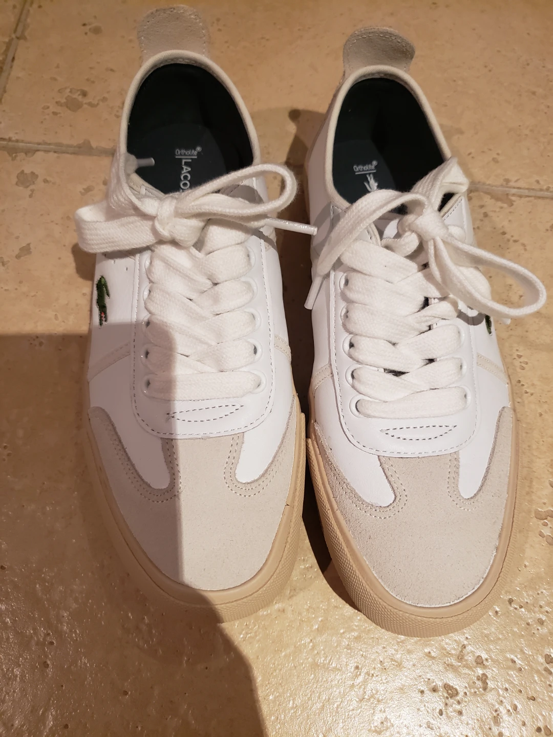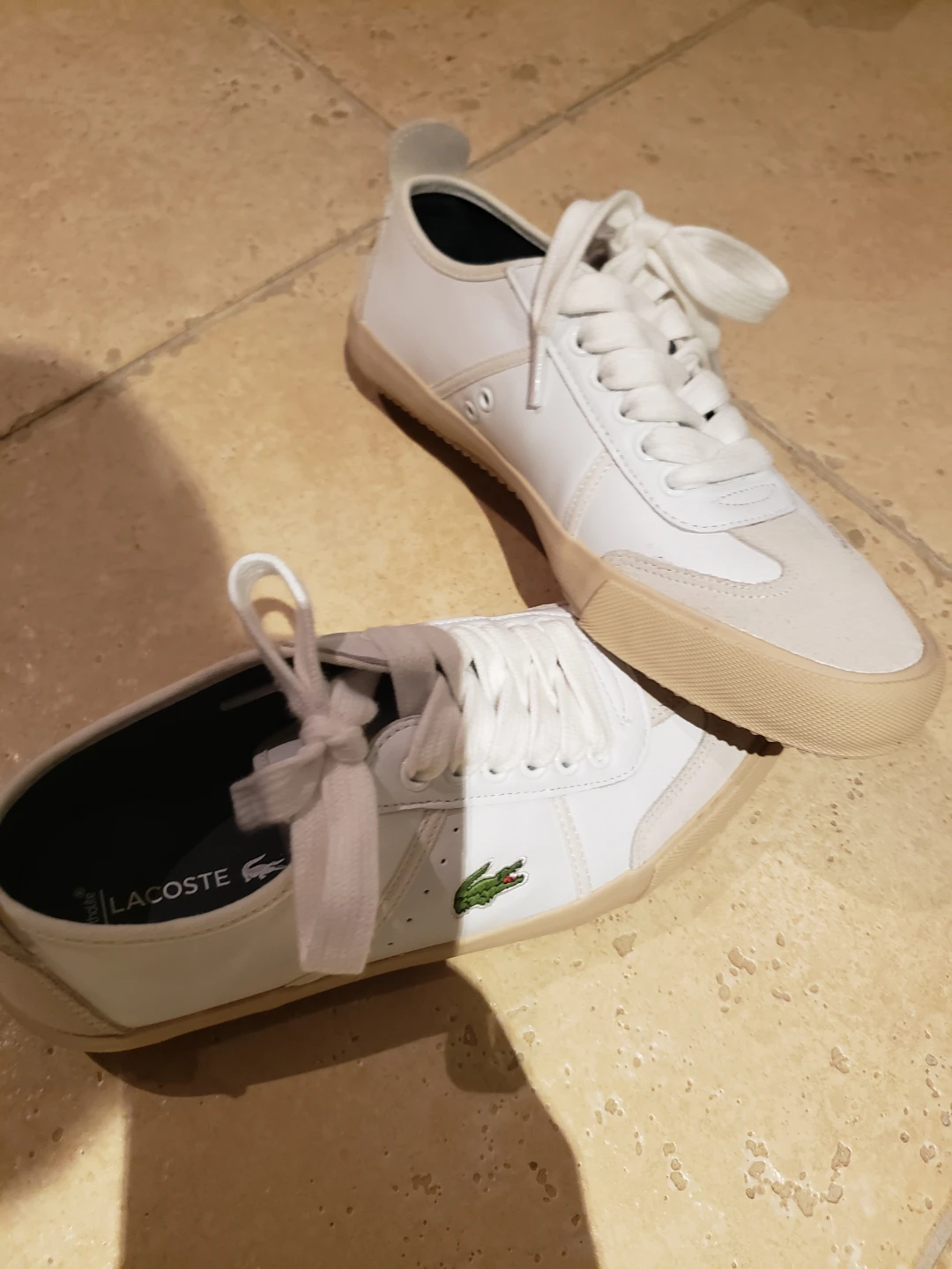 Selling a pair of Lacoste sneakers in white leather! They are in great condition and ready for a new owner. The classic Lacoste design is always in style, and these are super comfortable for everyday wear