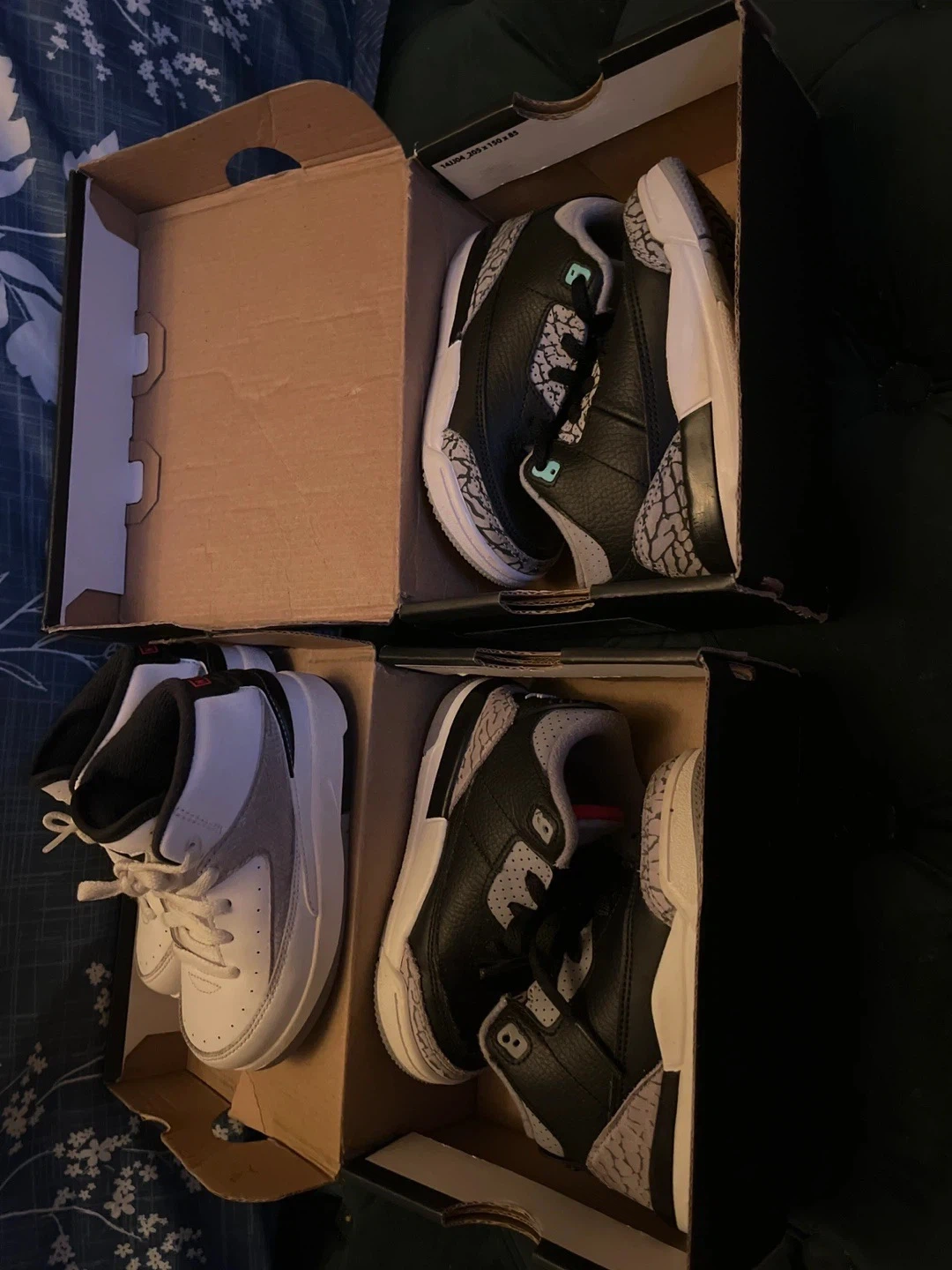 Selling a pair of Jordan 3 Retro sneakers! The shoes are in their original boxes. One pair is black with cement gray accents, and the other pair is white with gray accents. Buy all three for your little king for a better price than purchasing them separately.