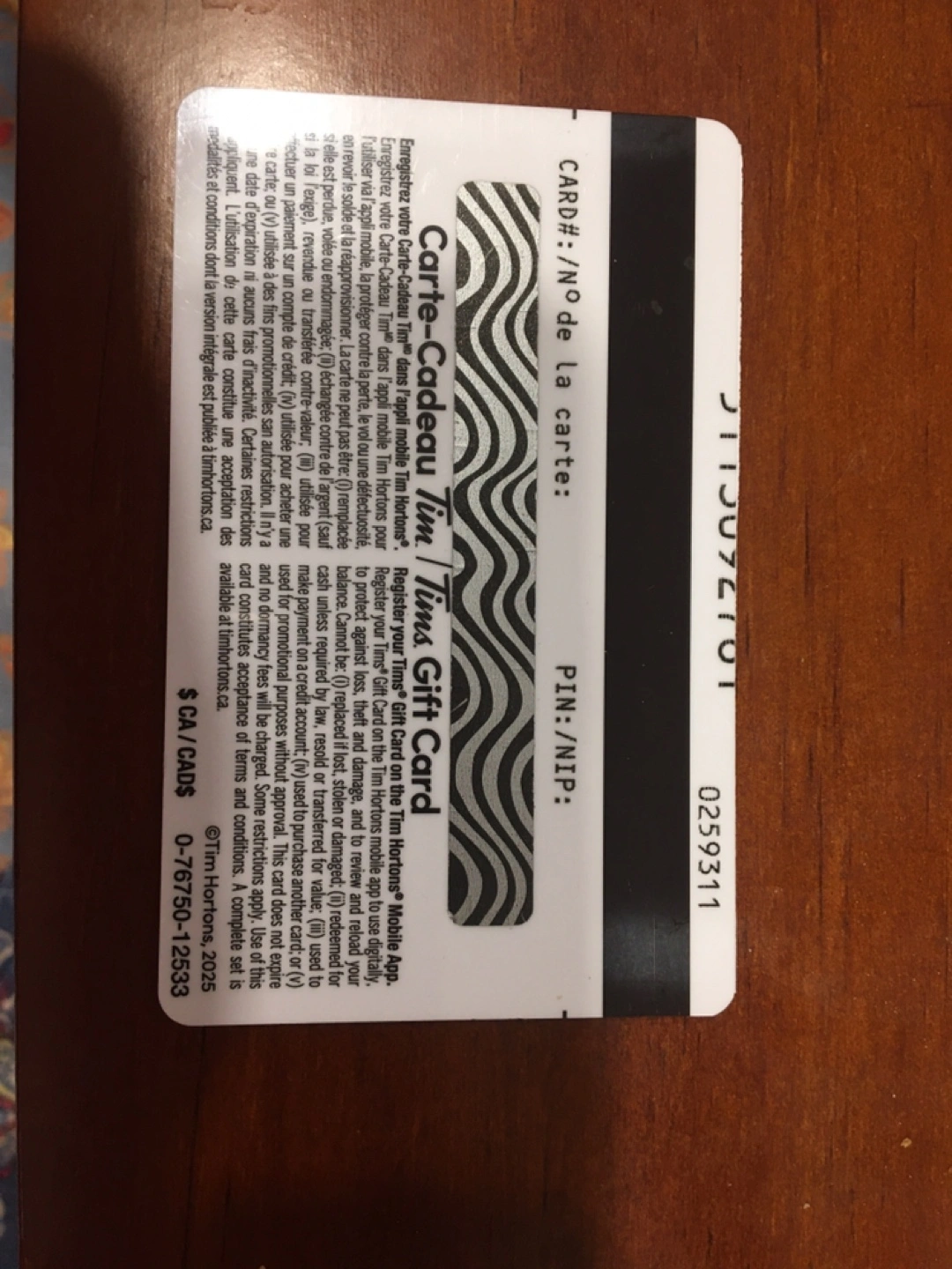 Selling a Tim Hortons gift card with a value of $15 CAD. Asking $8.
