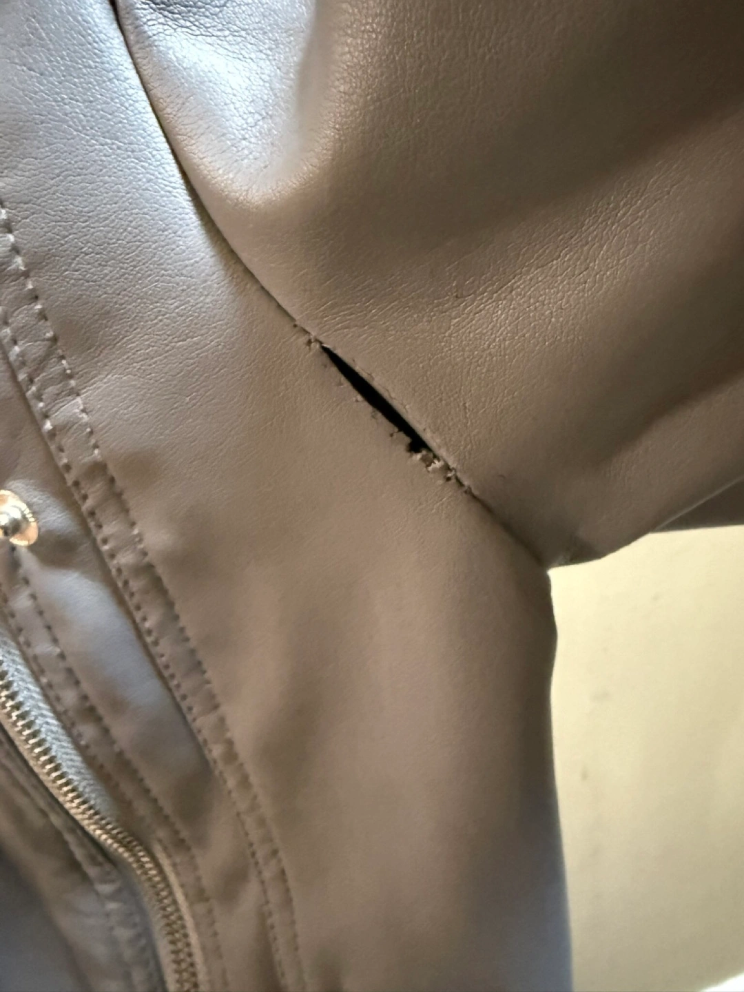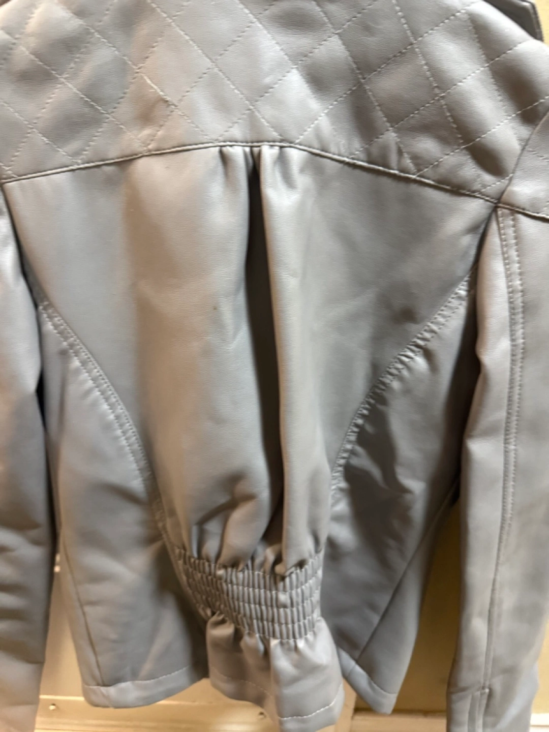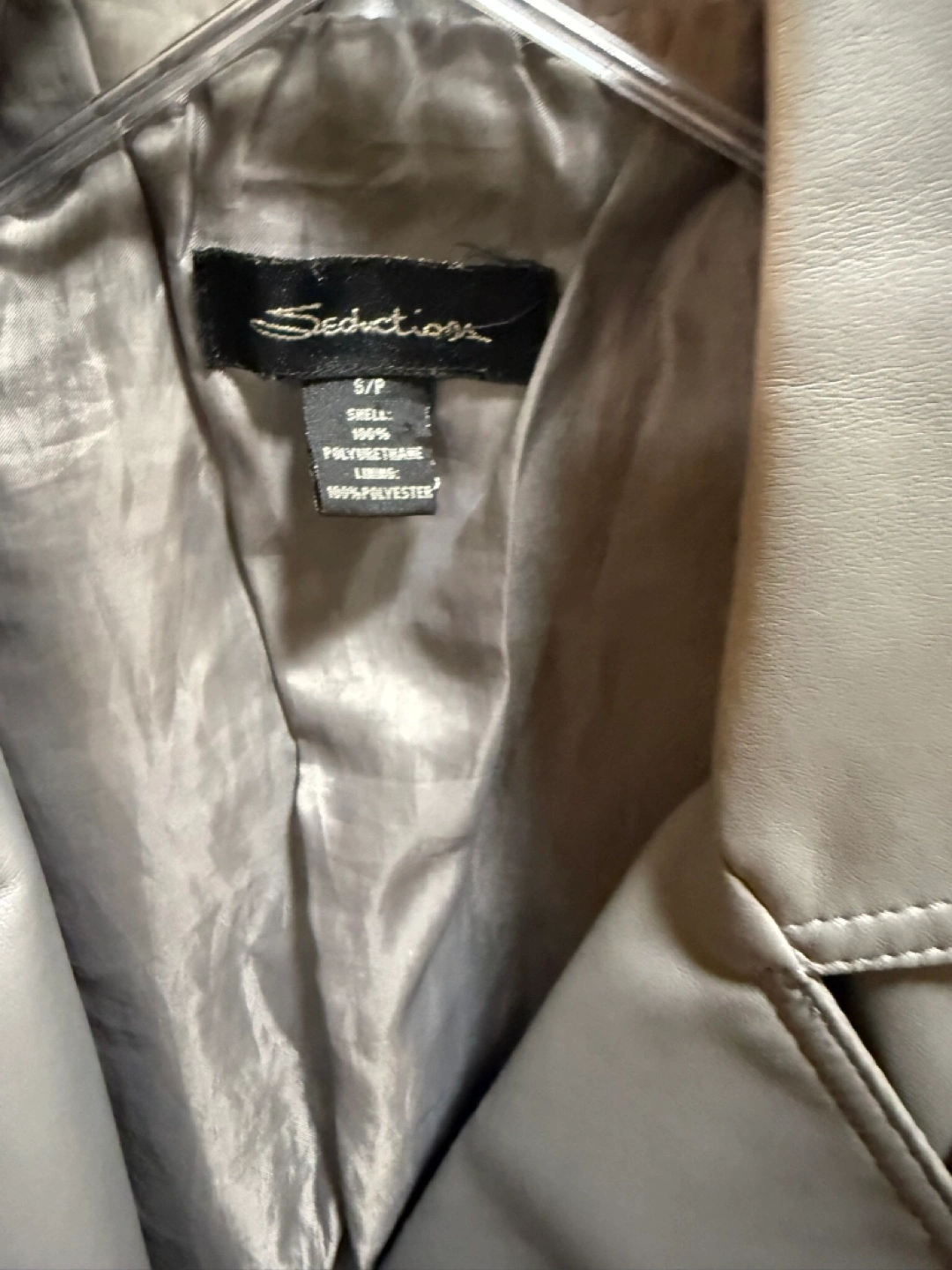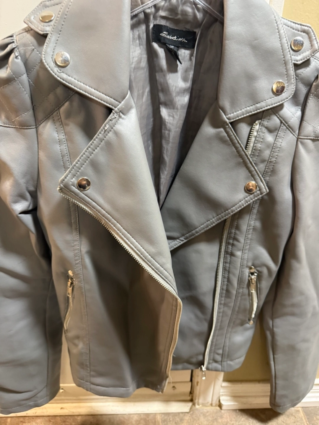 Selling a Seductions grey faux leather jacket in size small. It's made of 100% polyurethane shell and 100% polyester lining. There is a small tear in the armpit area.
