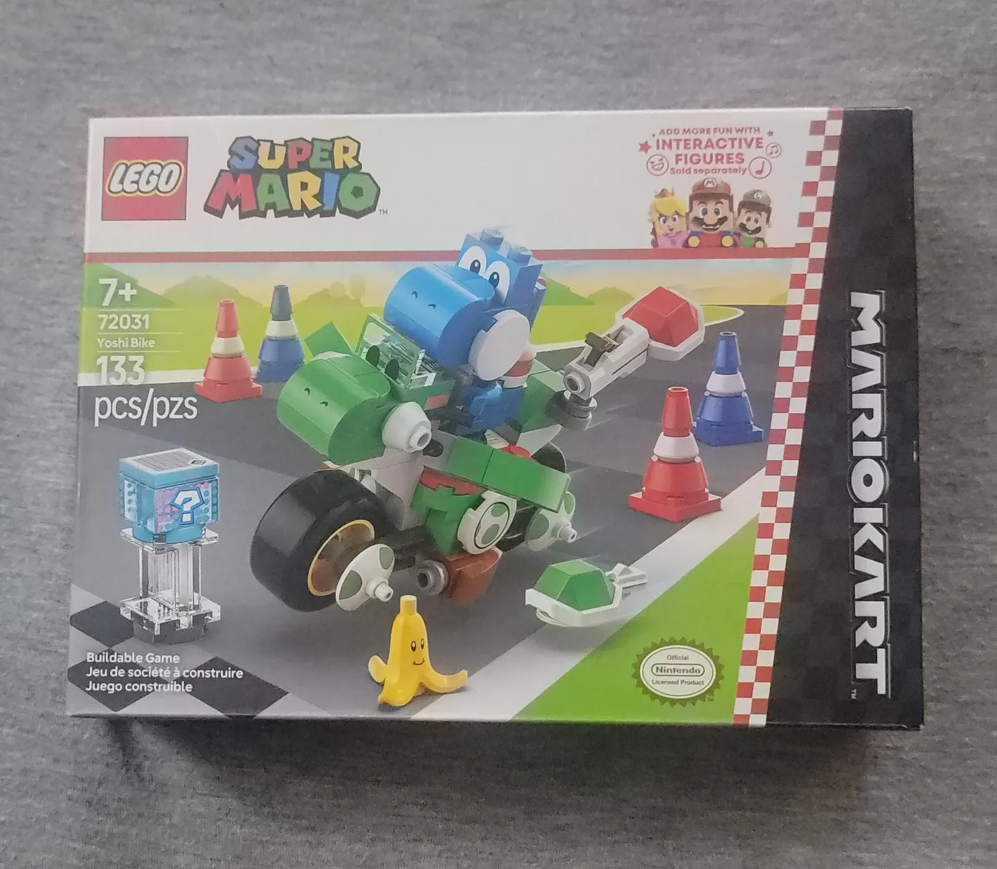 Selling a LEGO Super Mario Yoshi Bike set (72031) for ages 7+. This buildable game includes 133 pieces to construct Yoshi's bike and other fun elements from the Mario Kart world. Add more fun with interactive figures (sold separately)! Box included